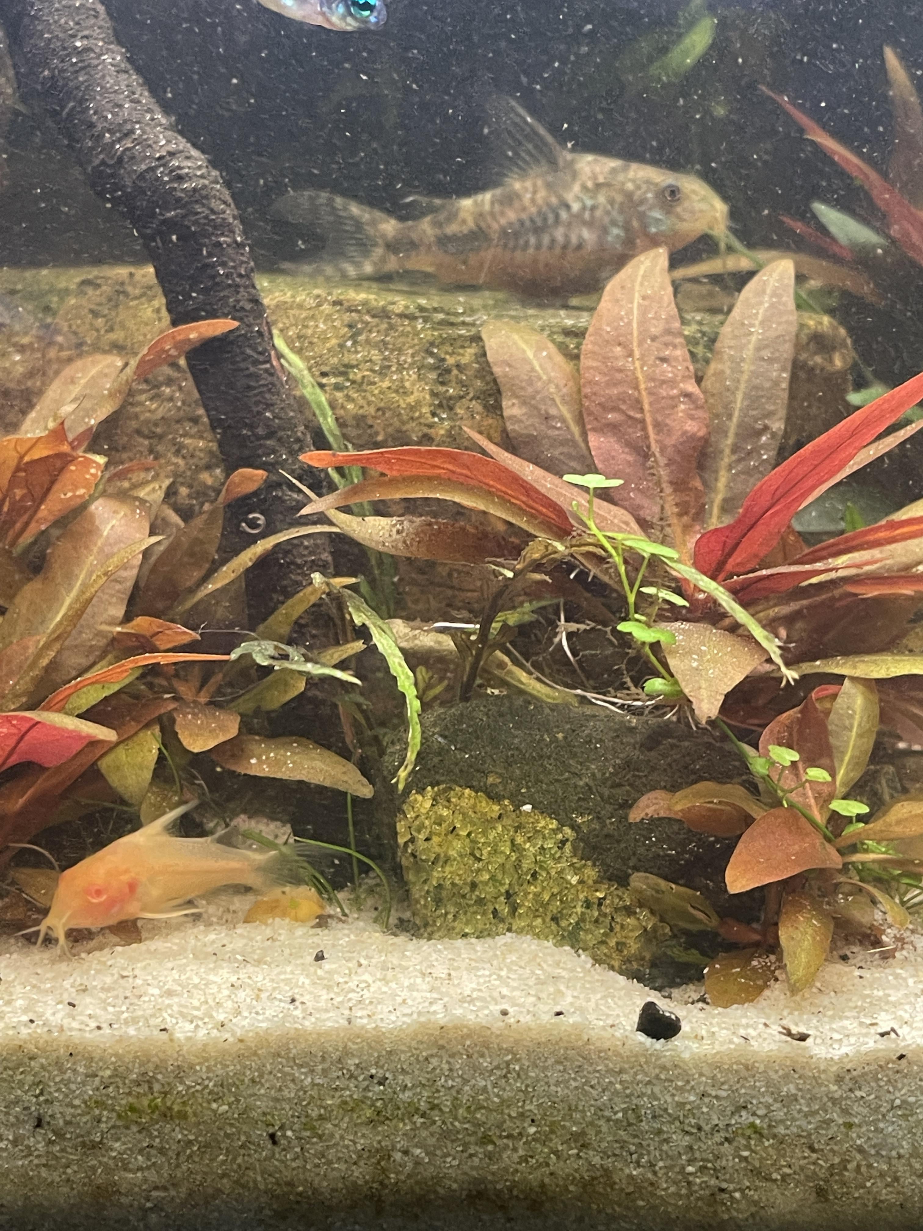 I found a few blue velvet shrimplets, but also this little guy. Iāve never had any albino Corydoras. I do have five peppered Corydoras, and they did lay eggs once, but Iāve never seen any fry before this one.
