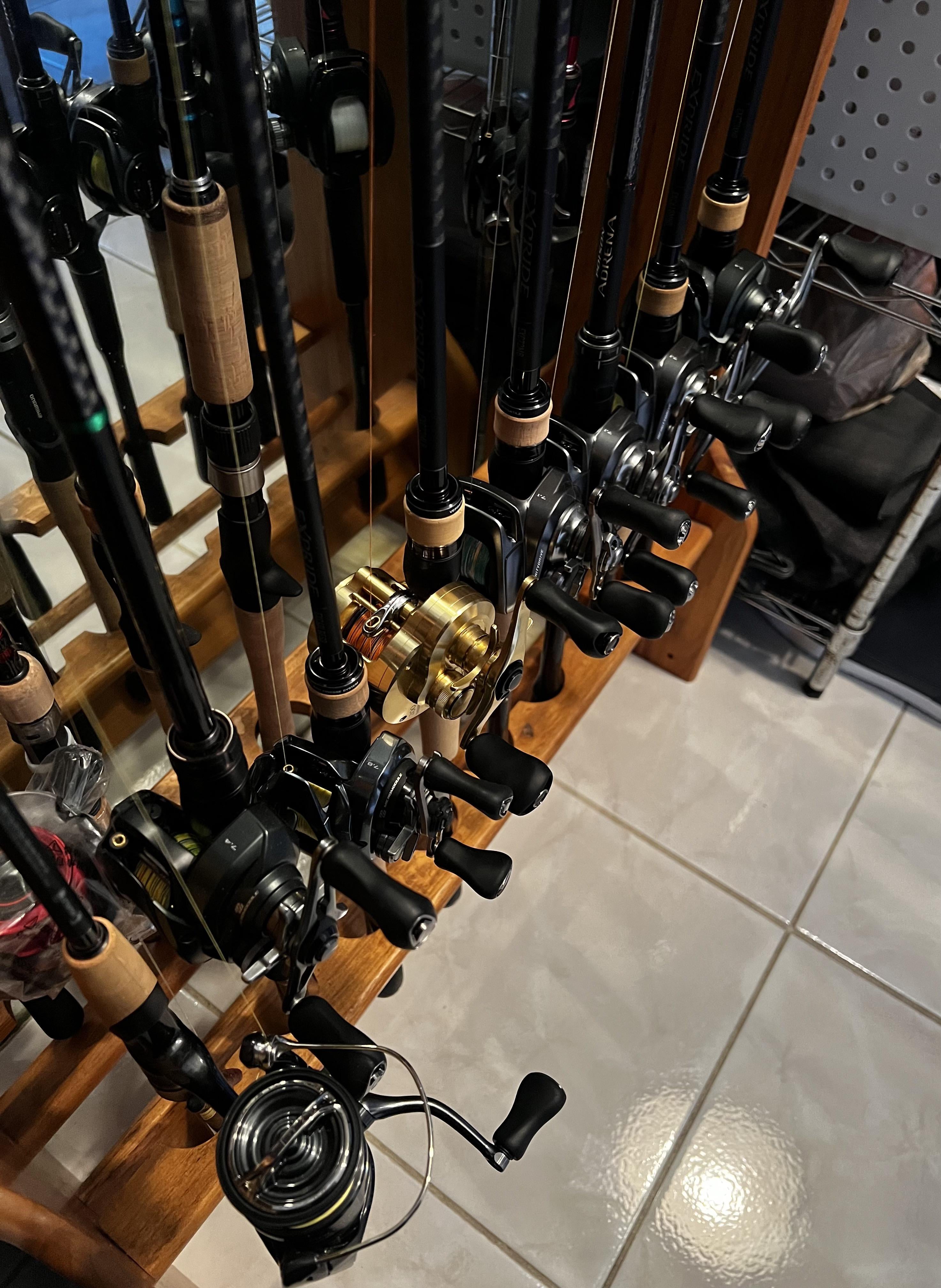 MyPimpHandIsLarge on February 7, 2026 6:59 pm Left to right: Vanford 2500/Expride 610ML (finesse) Curado 150MGL/Curado ML Glass (small moving baits) Aldebaron BFS/Expride BFS (BFS) Calcutta Conquest 200/Expride 72ML (small swimbait) Bantam HG/Expride 72M (all around) Bantam HG/Poison Adrena MH Glass (dedicated chatter) Bantam HG/Expride 610MH (versatile) Curado 200/Expride 73XH (rippin’ lips/frogs)