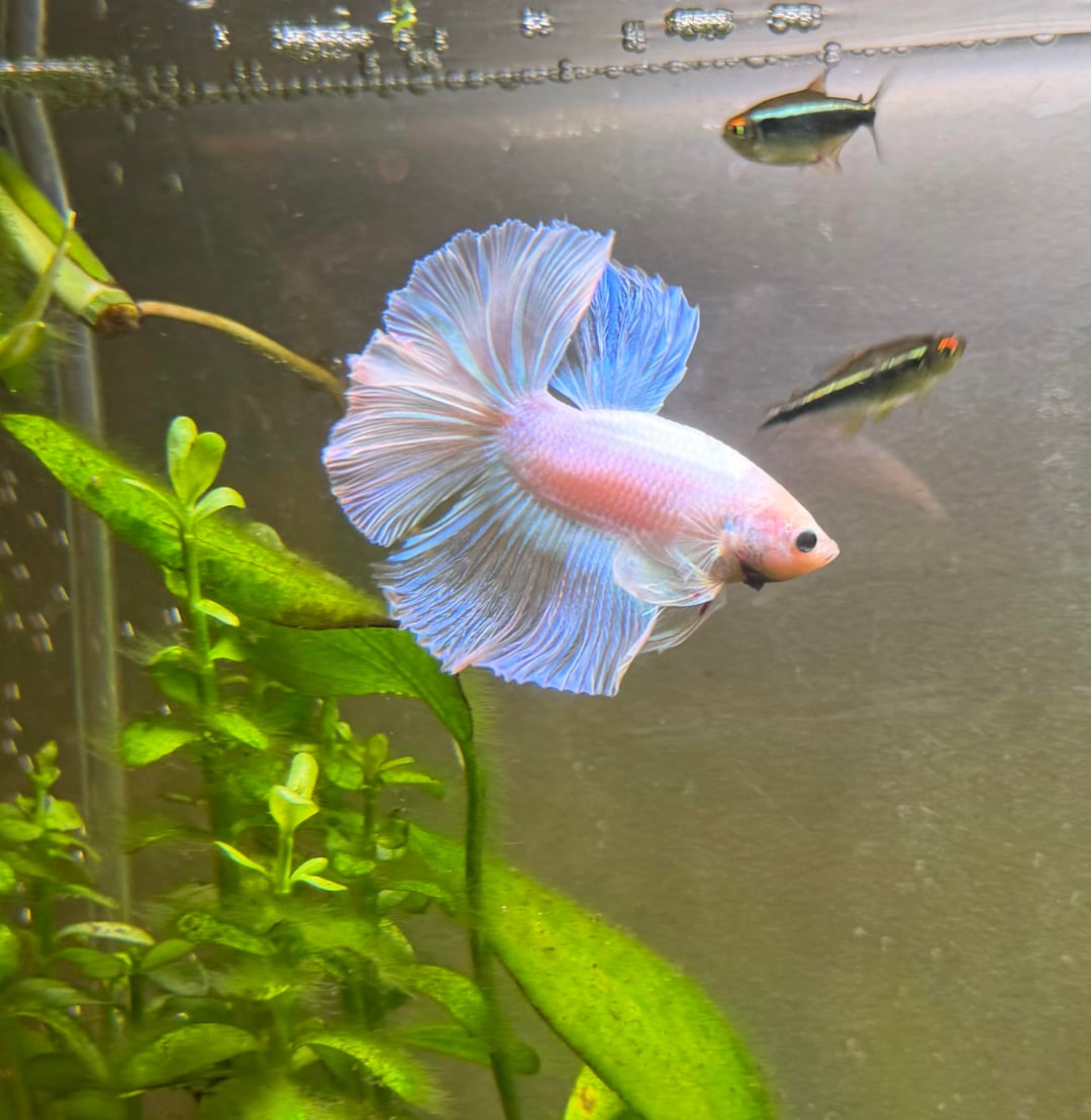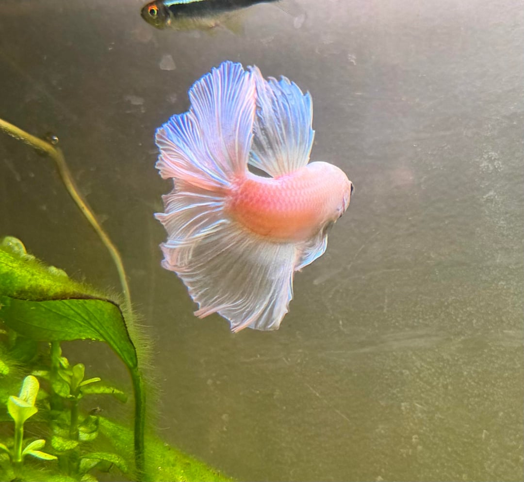 We brought him home the other day and we’ve been trying to figure it out. He’s a bit of a bigger guy and has a pale pink/ kind of whitish body that turns light blue when the light reflects on it and almost gives him a cotton candy kinda look. his fins are the same too. I’ve just never really seen another beta with this colour pattern and it’s had me stumped.