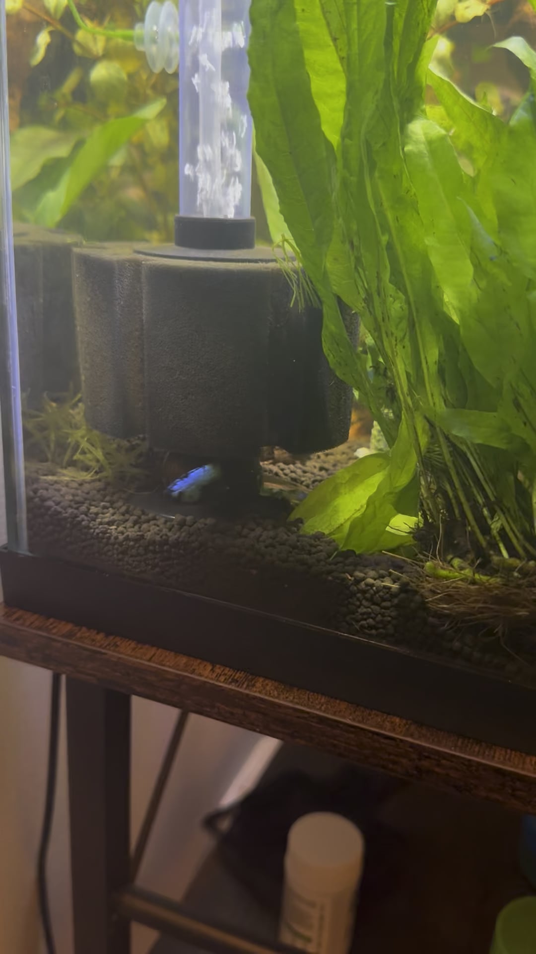 I caught him sleeping against the filter last night, but honestly he swims around as he pleases – per the end of the video – so I know it’s not too strong. He also lodges himself and swims back and forth between the glass and the plant to the right as well.