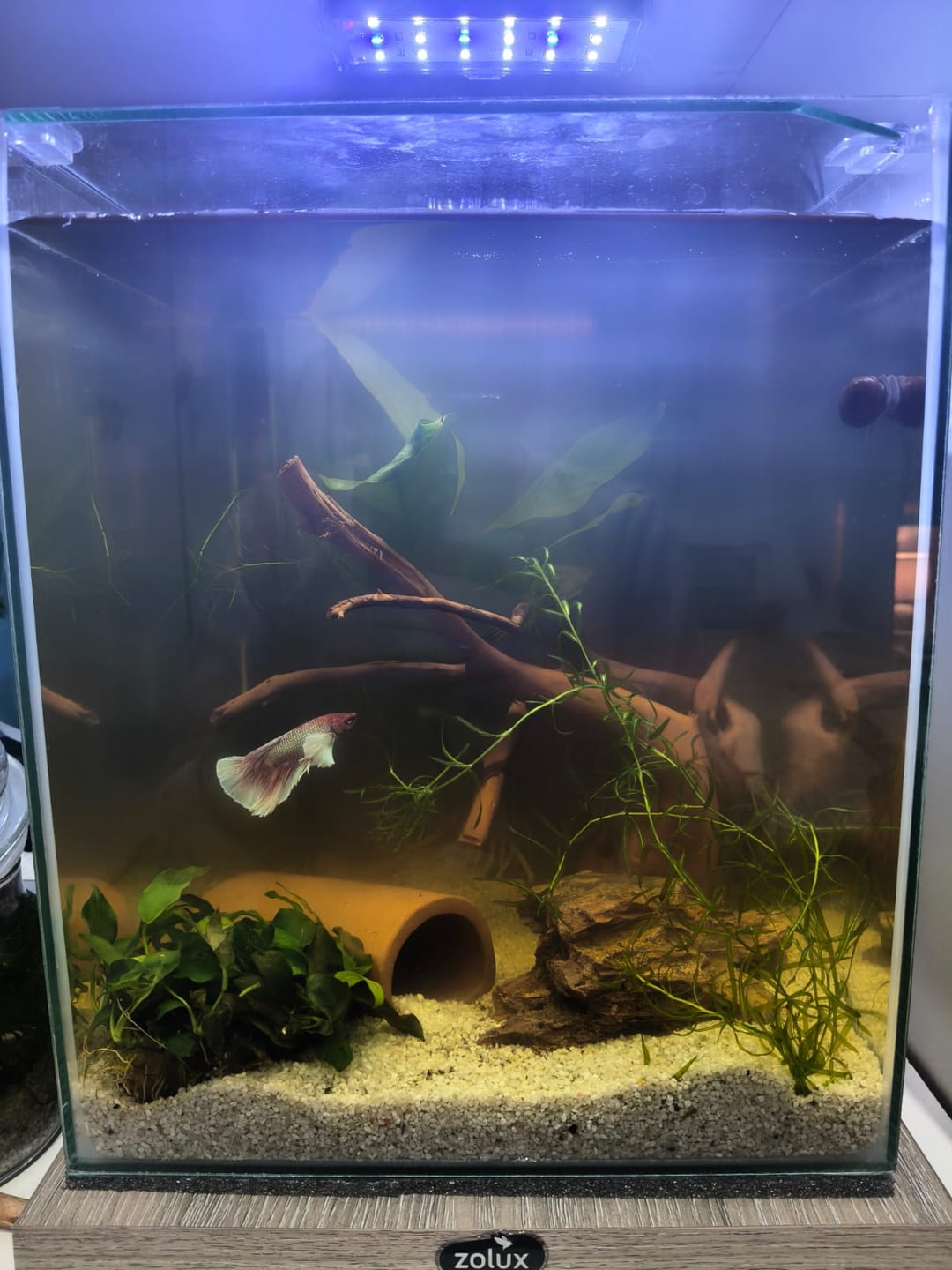 There are no specialized acquarium shops near me, but there is one that sells reptiles and had some supplies, so i managed to find a 20L acquarium (plus filter and heater), some live plants (anubias) and a piece of wood. I had some other stuff left over from when I had an acquarium as a kid (sand, rocks, an algae scraper and a net).