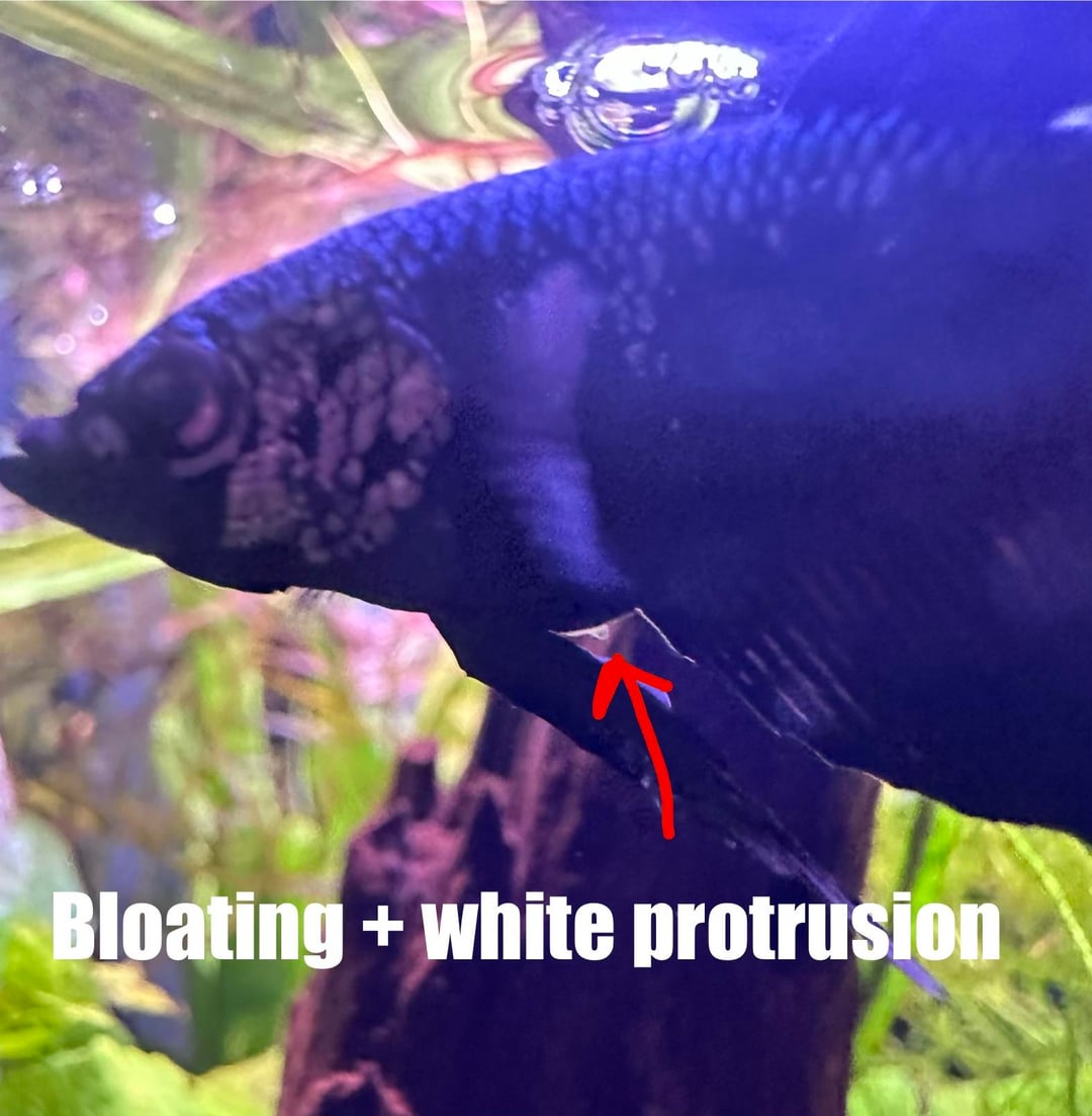 The protrusion looked the same up until today. Even just yesterday it was a small white bump. But over the past month, I’ve also seen his fins slowly, very slowly degrading/rotting back, despite the treatments, so I can only assume it’s part of the root issue of the bloating and protrusion.