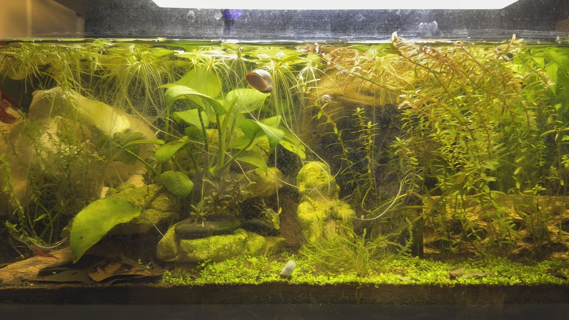 5 gallons, 1 Betta (Sam), 4 Ramshorn Snails (started with one stowaway!, possibly 3-4 cherry shrimp (they are good at hiding)—plants are Java Fern, Anubias, Rotula, Bucephalandra, Monte Carlo, and some Frogbit.