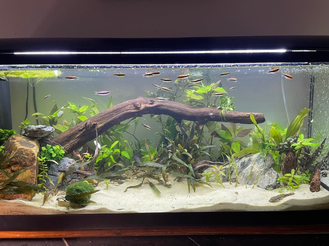 Looks good! I might move some plants near the base of the wood to continue the left to right flow. In general, tanks look more natural when you concentrate plant growth near hardscape / thin things out the further from a visual ‘anchor’ they are.