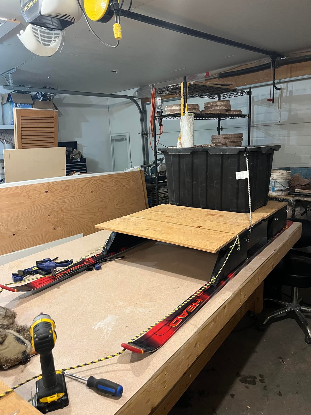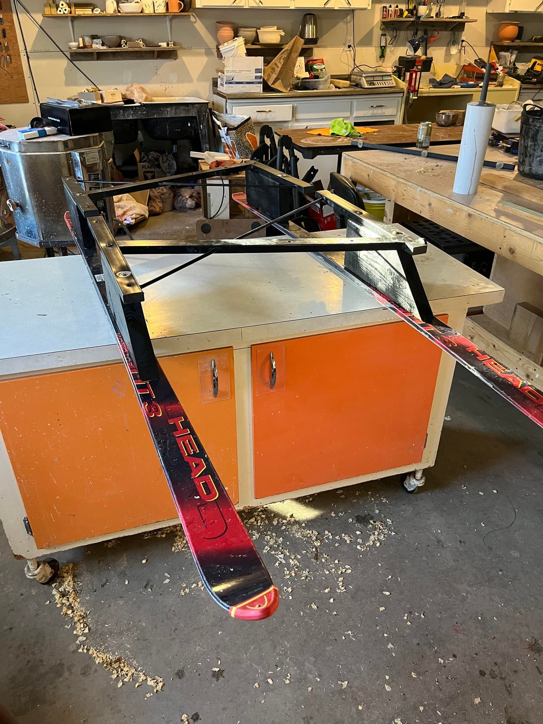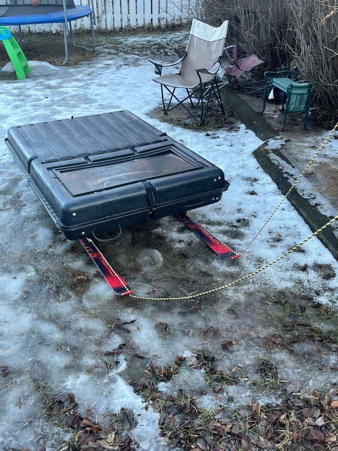 Just got into ice fishing this year so I’m trying to have fun while keeping it budget friendly. I picked up some skis off marketplace and built them into a sled to carry the folding shelter I also picked up. The frame is an old steel desk I had which makes for great lightweight strength. I added a plywood deck too.She turned out pretty sweet but I need to add some mods to carry more gear on top.