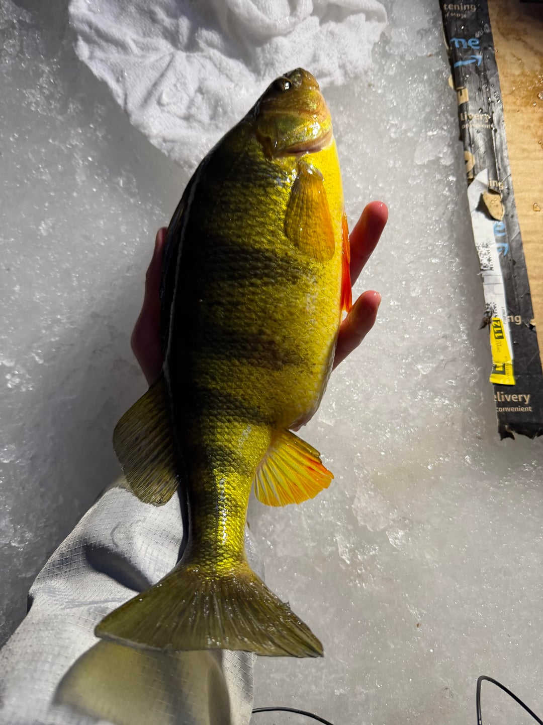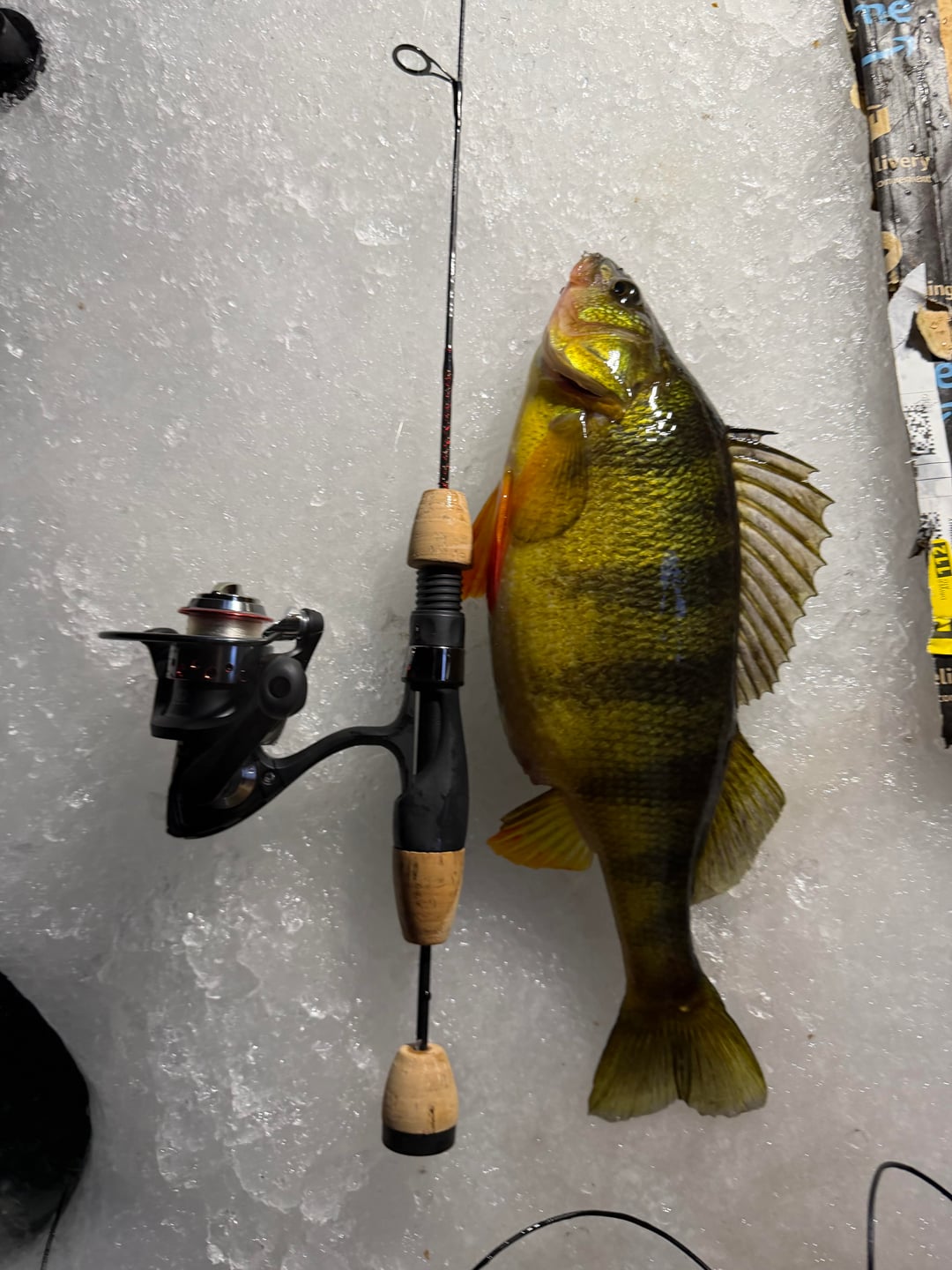 I live on long island and we pretty much never get safe ice. but it’s been so extreme cold this winter that ice is 6-8 inches. i decided to go out and try ice fishing for the first time and it was fun only had one bite but it was this giant perch. or at least giant for a small pond