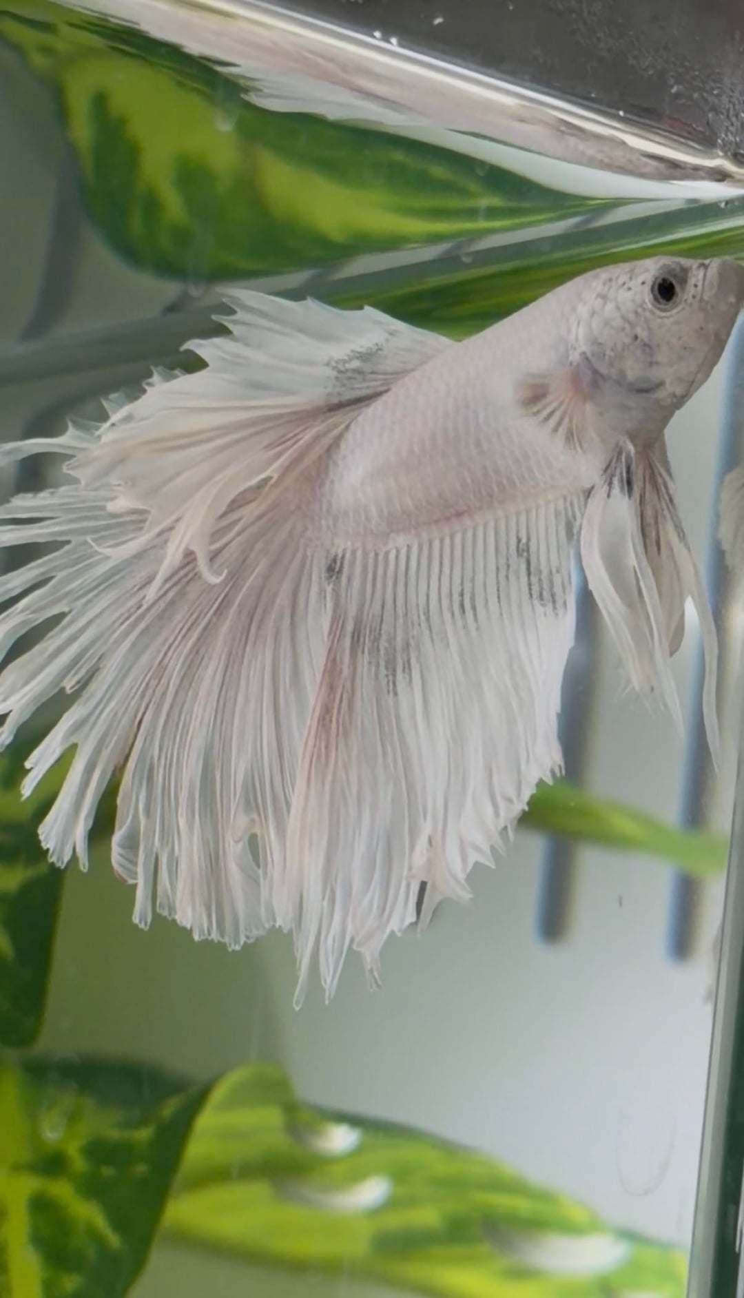 First betta. Got him in December. He’s in a 5 gallon tank. He used to have a fake plastic bonsai tree but I took it out 2 days ago because I noticed his fins have been looking tattered. I added two small live anubias plans instead, a second little hiding cave, and a silk leaf hammock.