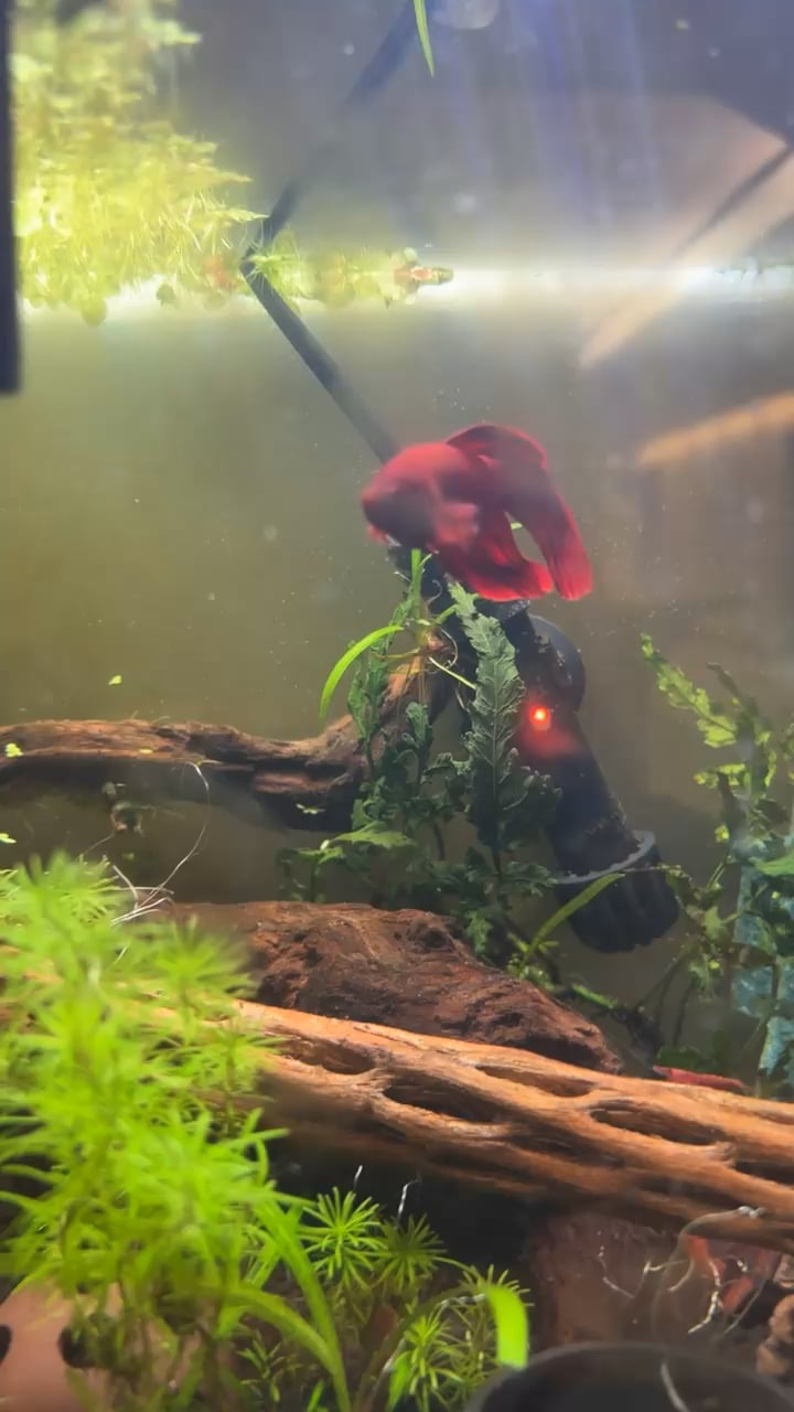 Your Betta is absolutely STUNNING! Like red velvet! And your cherry shrimp are adorable!! I have to laugh at how both of them were peeking up at your Betta from the driftwood as to say “ hey you try and get us!” And then your BETTA DID, and they were like … SEE YA!!! Bolt away fast! lol!