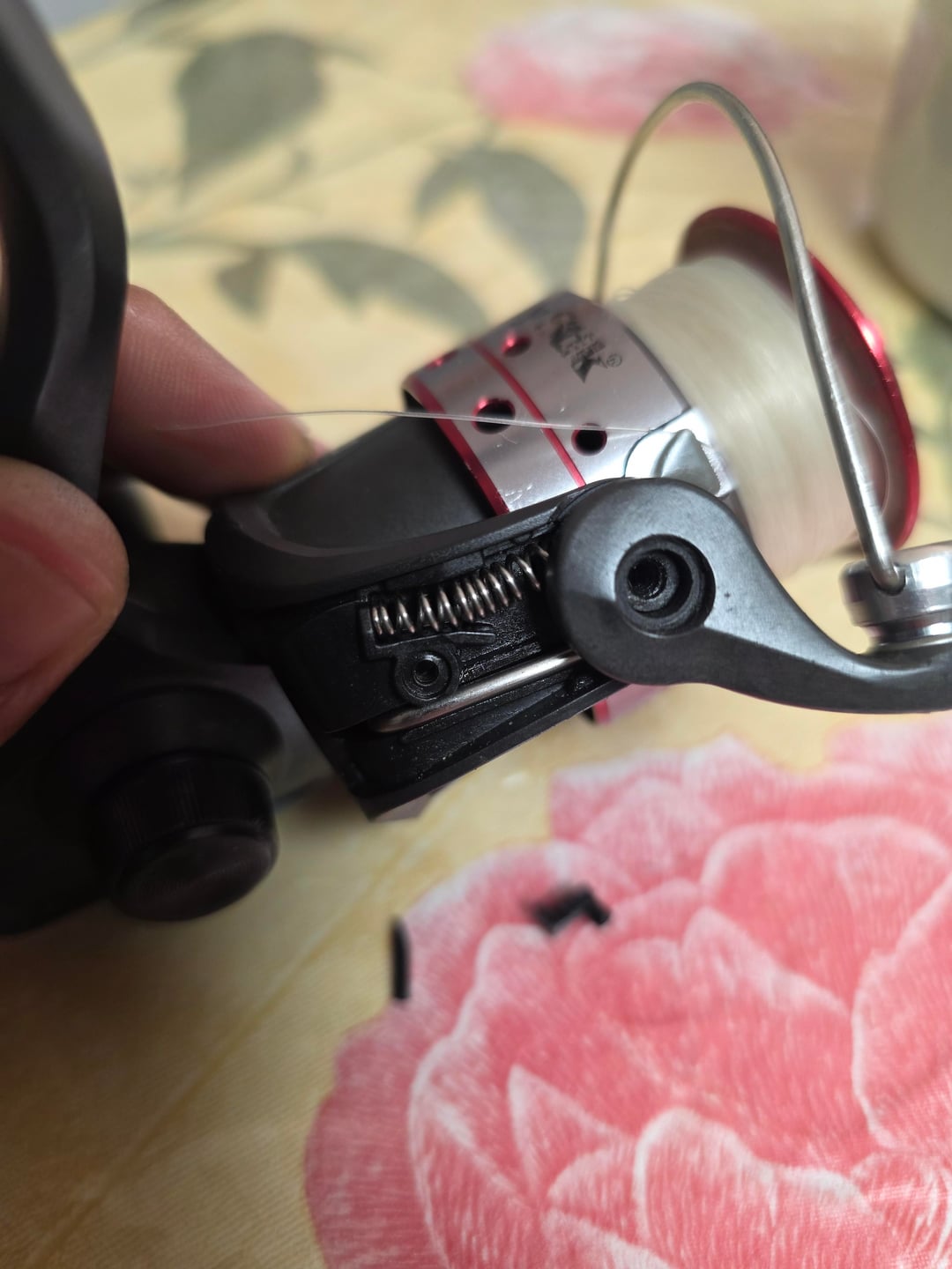 So the metal part is the bail trip mechanism and the plastic piece that goes into the spring is what causes the bail to be springy. This is fixable. Go slow, take your time. The plastic piece and the metal piece have slots in the plastic that they connect to.