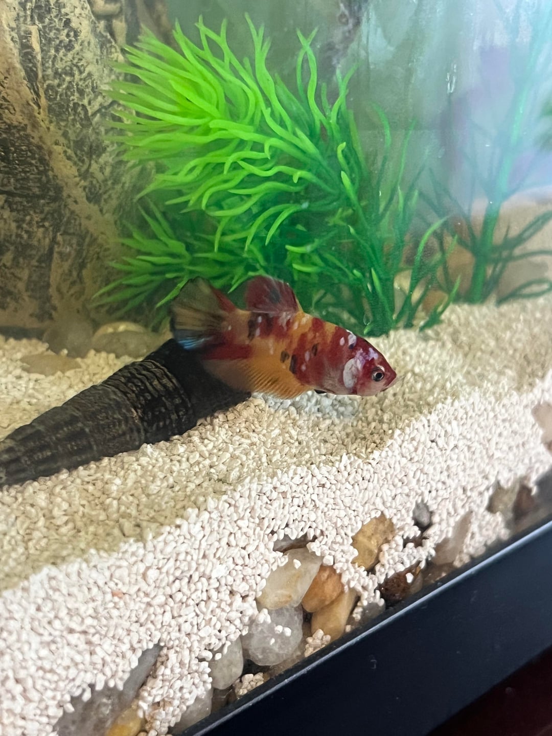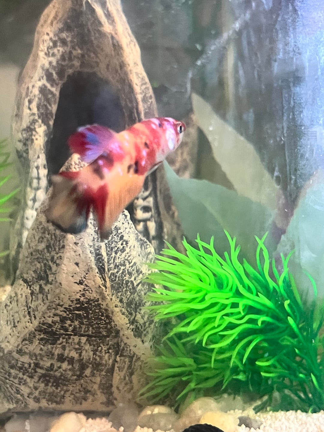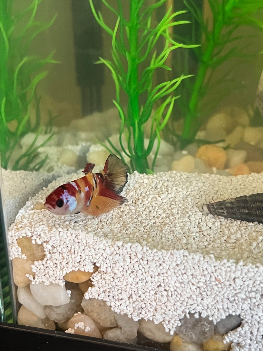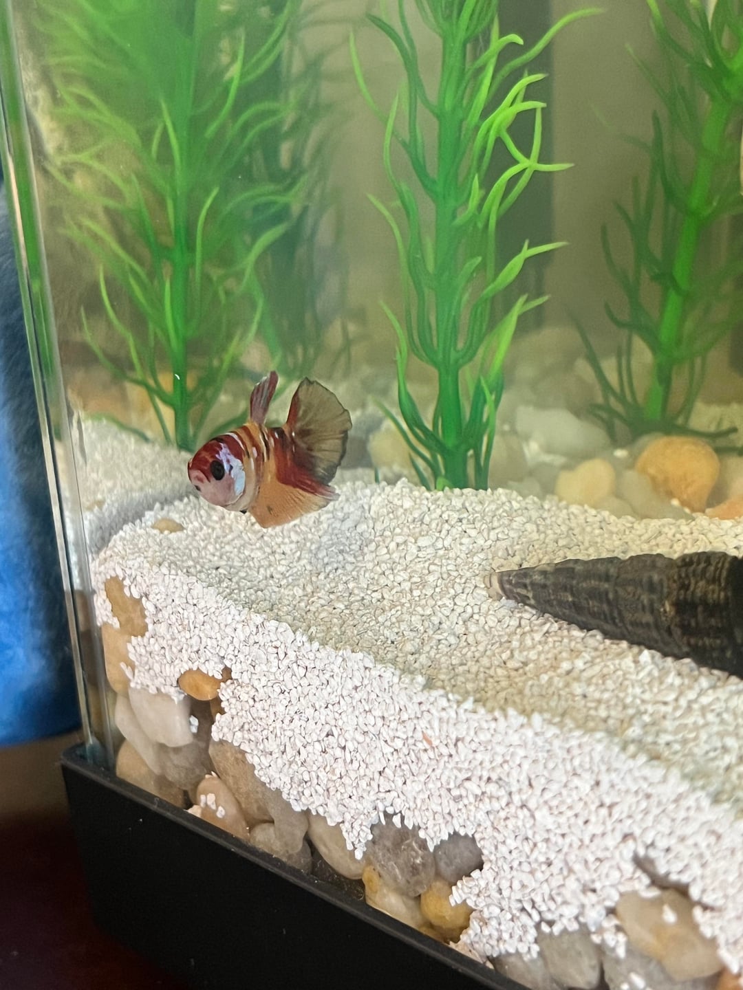 Hello everyone. This is Fishy, and was wondering if anyone had any tips or advice on how to keep a betta in a 5 gal tank happy, especially since I’ve read short finned bettas are more active? This is his starter tank since we just adopted him, but do plan on going bigger at some point! He has a heater, filter, snail, and a moss ball. He has a skull hide and some seashells to rest near the surface of the water. TYIA!!