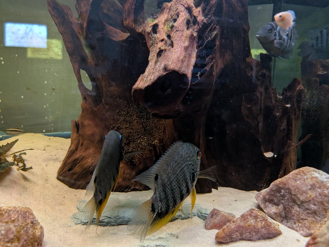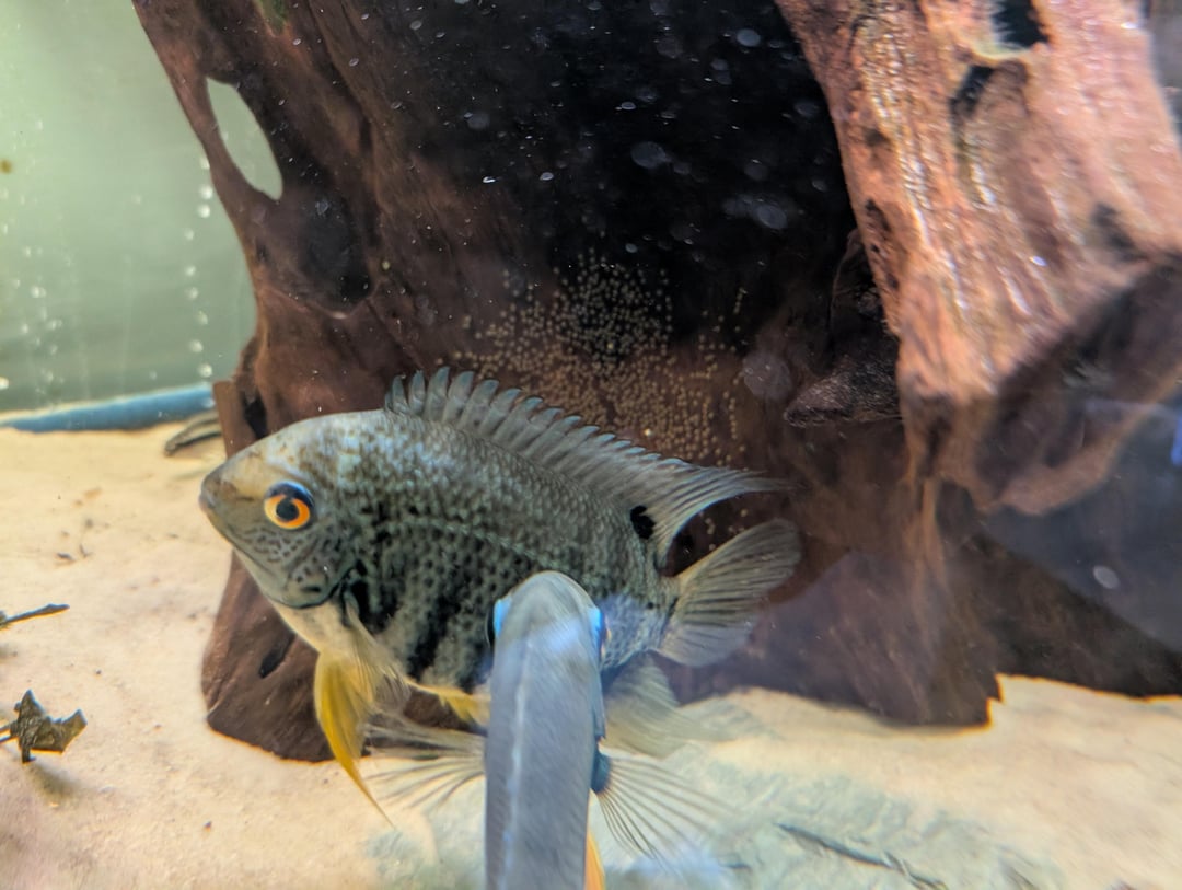 The severums are protecting their eggs from the jewel cichlid and convicts in my tank. The issue is this use to be the stump of driftwood that the convicts were breeding in. The first time the severums fry didn't make it due to the other fish. What can I do to help the severums' second try a successful one?