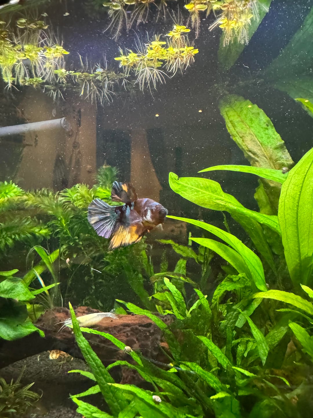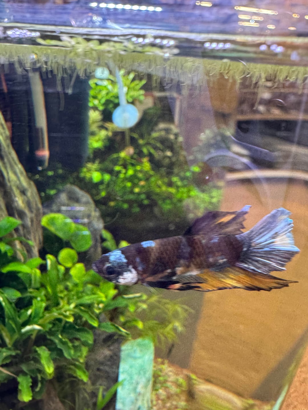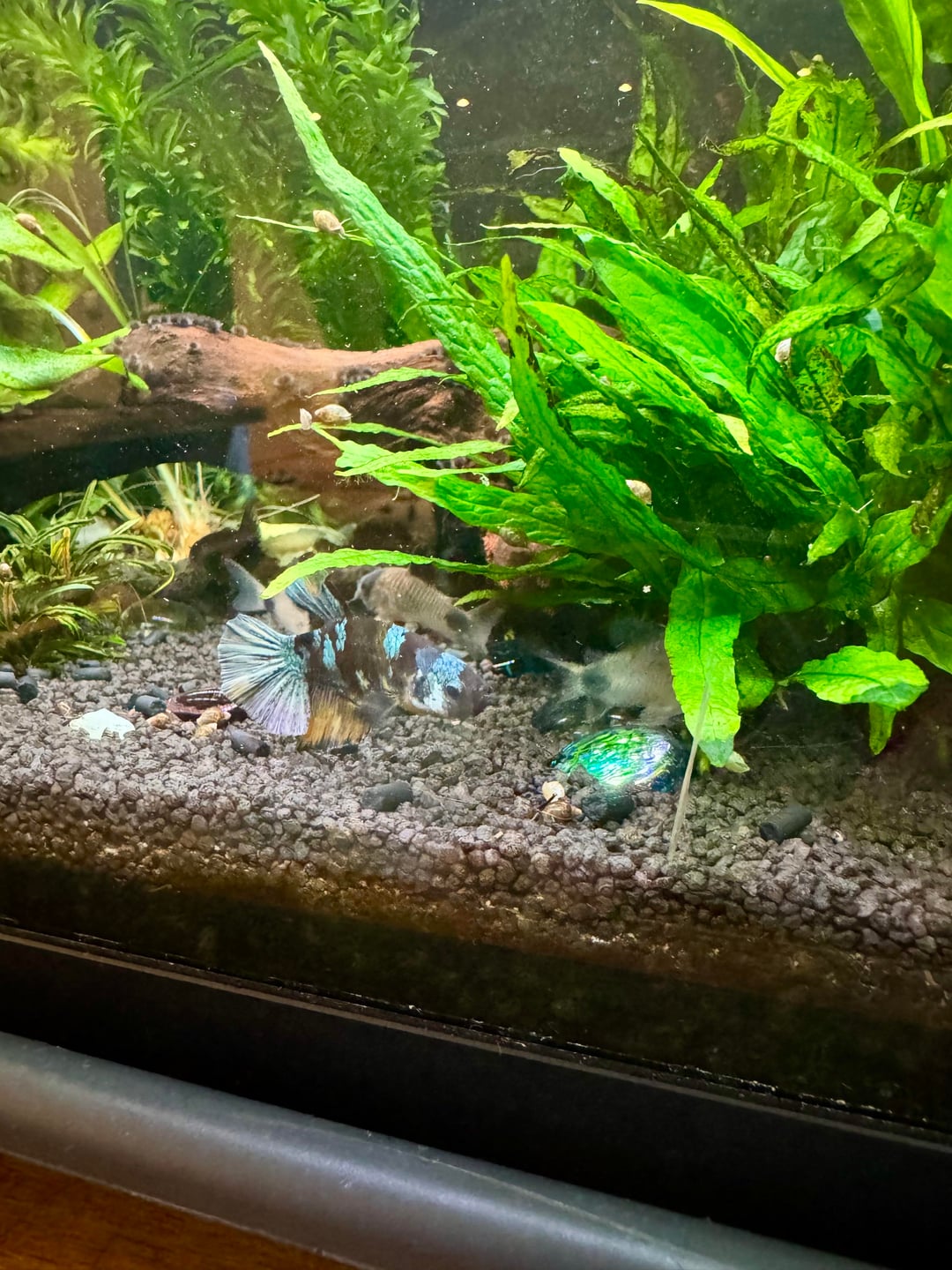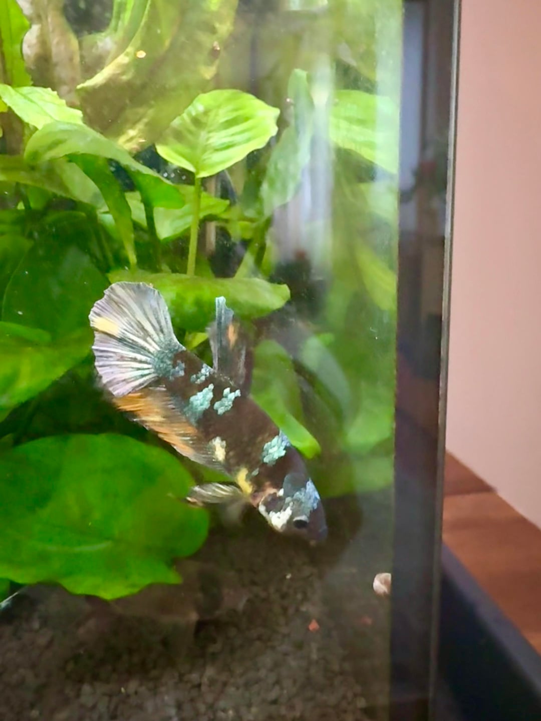 Meet my newest addition, Thunder! All the colors of a beautiful thunderstorm! I met him Wednesday and decided to βsleep on itβ. Well Iβd decided quickly to go back. First plan – go by before work, pay for him and get him on the way home. Schedule changed. Second plan – leave hospital by 6:20 to go get him by 7:20 when the store closed. Nope. Left the hospital at 7:20. π Third plan – get up early and get him at 10 when they opened today. Nope. Kiddo was throwing up last night. I managed to get by this afternoon just praying heβd be there. All I can say is that it must totally be meant to be. Iβve never had a Plakat so Iβm so excited to watch and learn more about him. Iβm enamored by his coloring! He flared once at his Corey tank mates and decided quickly they were a-ok. I hope he likes it here π₯°