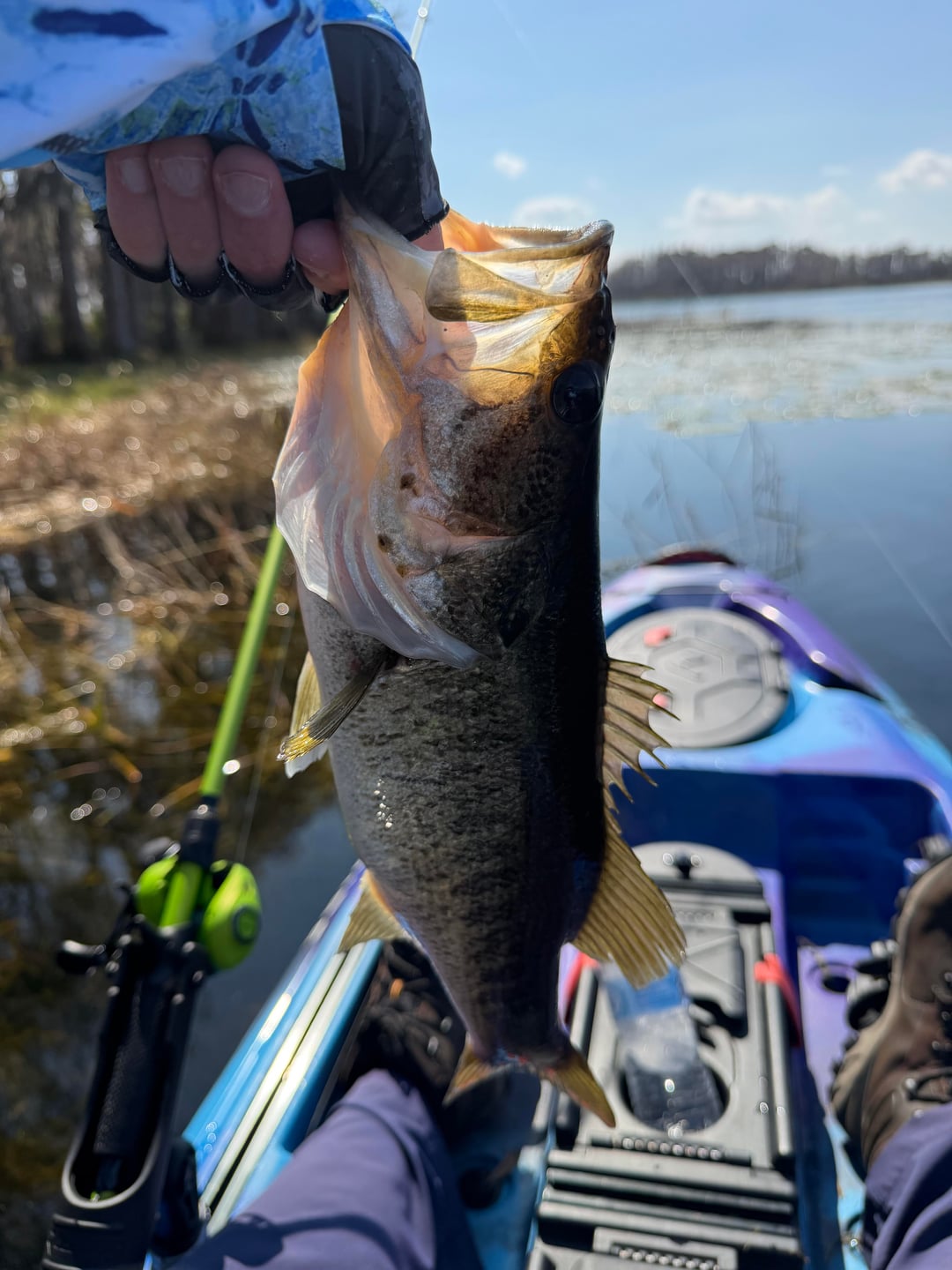 Had a great time out on my Kayak today! The bite was so slow in the morning. Nothing on top water frog or my fluke. The minute I switched to a Gary Yamamoto Senko, the bite was on! I was using a green pumpkin Senko with red flake. Texas rigged weightless.