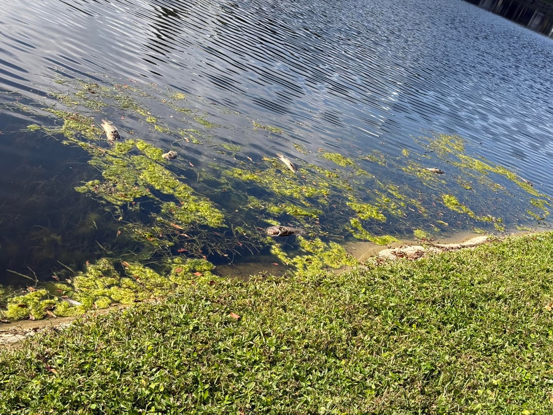 Dozens of peacock bass have been dying in this pond in Pompano Beach, FL. There has been an algal bloom that I thought might be related. Also, the cold front a few weeks ago forced quite a few iguana to drown in the pond and they have just been floating there since then it seems. Maybe bacteria from the rotting iguanas is causing it somehow? I really don’t know.