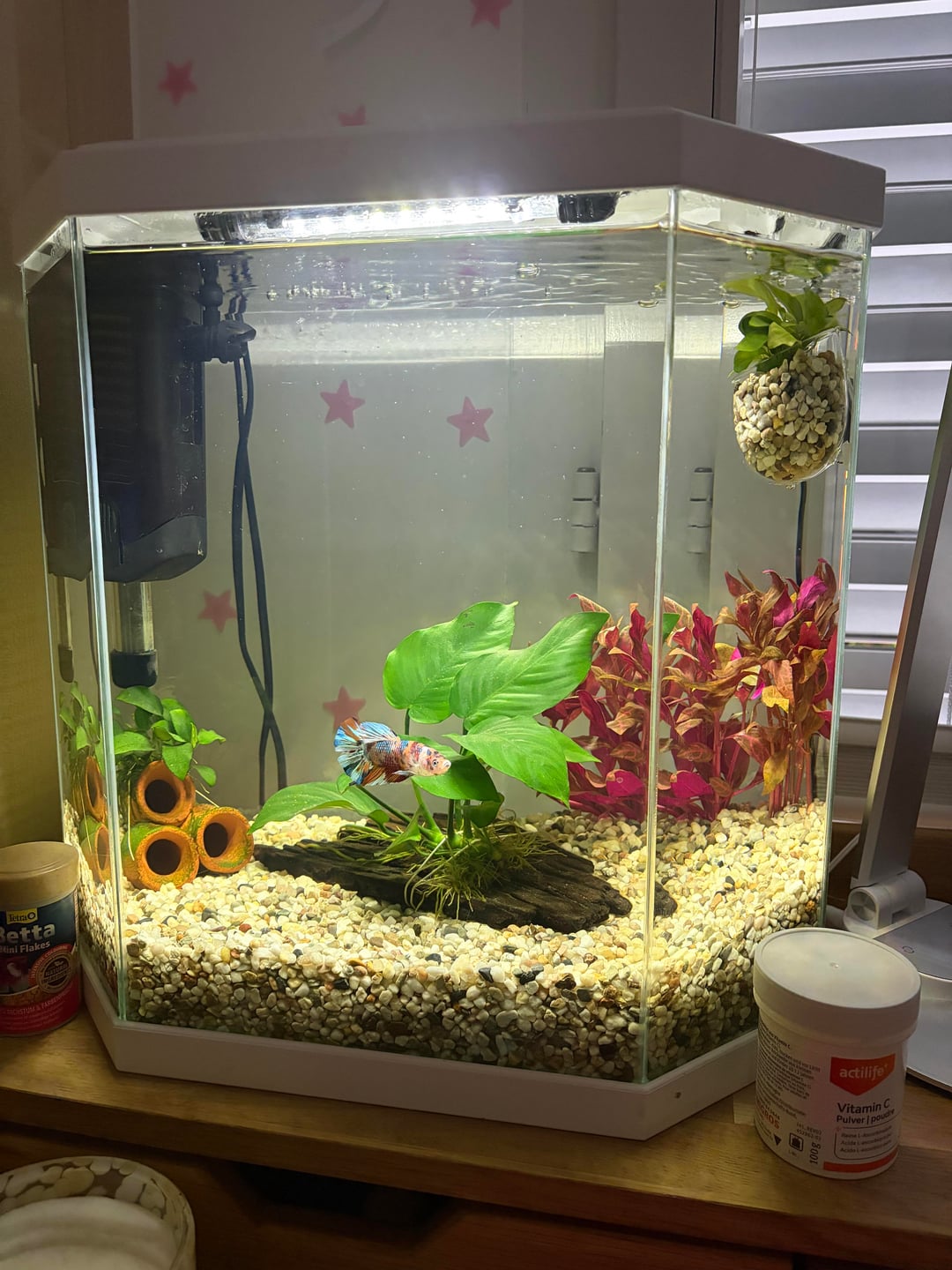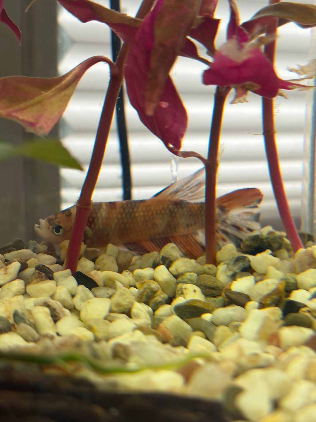 The “liquid co2” if that’s what your friend was dosing every day is not co2, it’s poison to kill off algae. Dosing an entire tank does nothing for algae but it can and sometimes does affect fish very negatively. Especially if you dose it every day??? On top of that, the tank is very bright with nothing tall to offer the fish shade and cover. The surface and middle are totally empty, and those are the main areas a betta generally occupies. I see you have the fluval internal filter without anything to baffle the flow too. I have their filter too and even when dialed all the way down the flow is still 100% too strong for a betta.