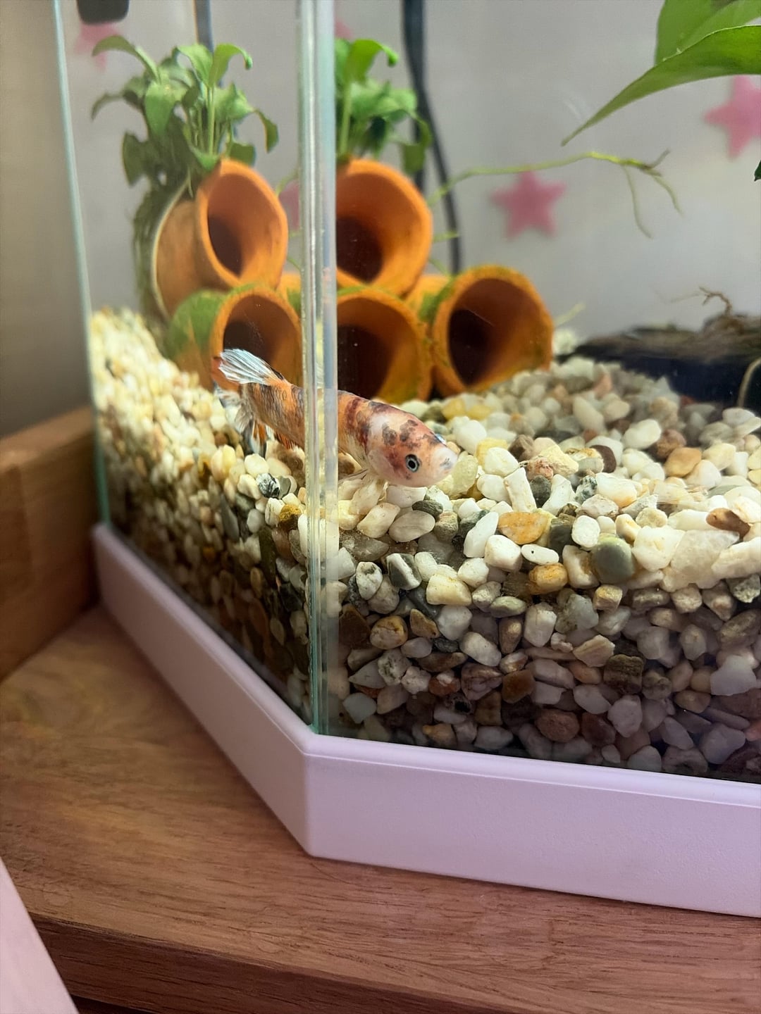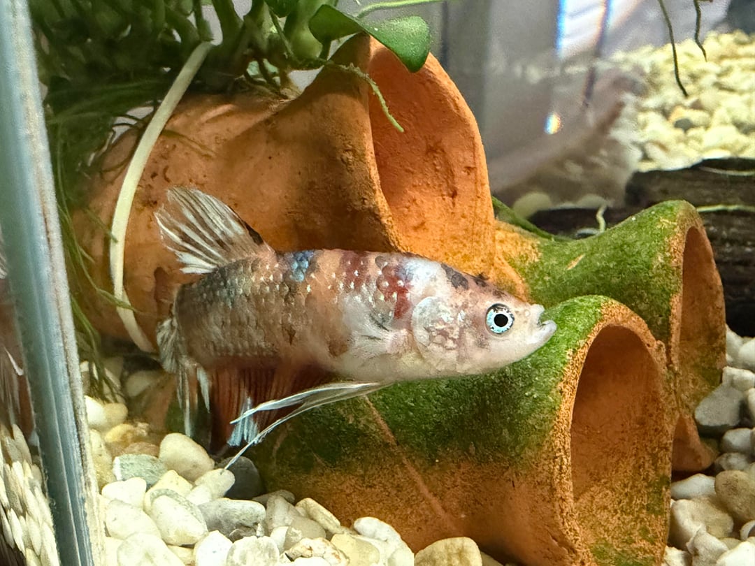 now a lot of his colour has noticeably faded and he just lies around the whole time with his mouth open. he only moves when i stir the water near him a bit with a net. i fed him this morning, he took no interest in the food, he would always swim up to the top when i'd feed him but today he just stayed at the bottom. he doesn't even react when i tap or knock on the aquarium.