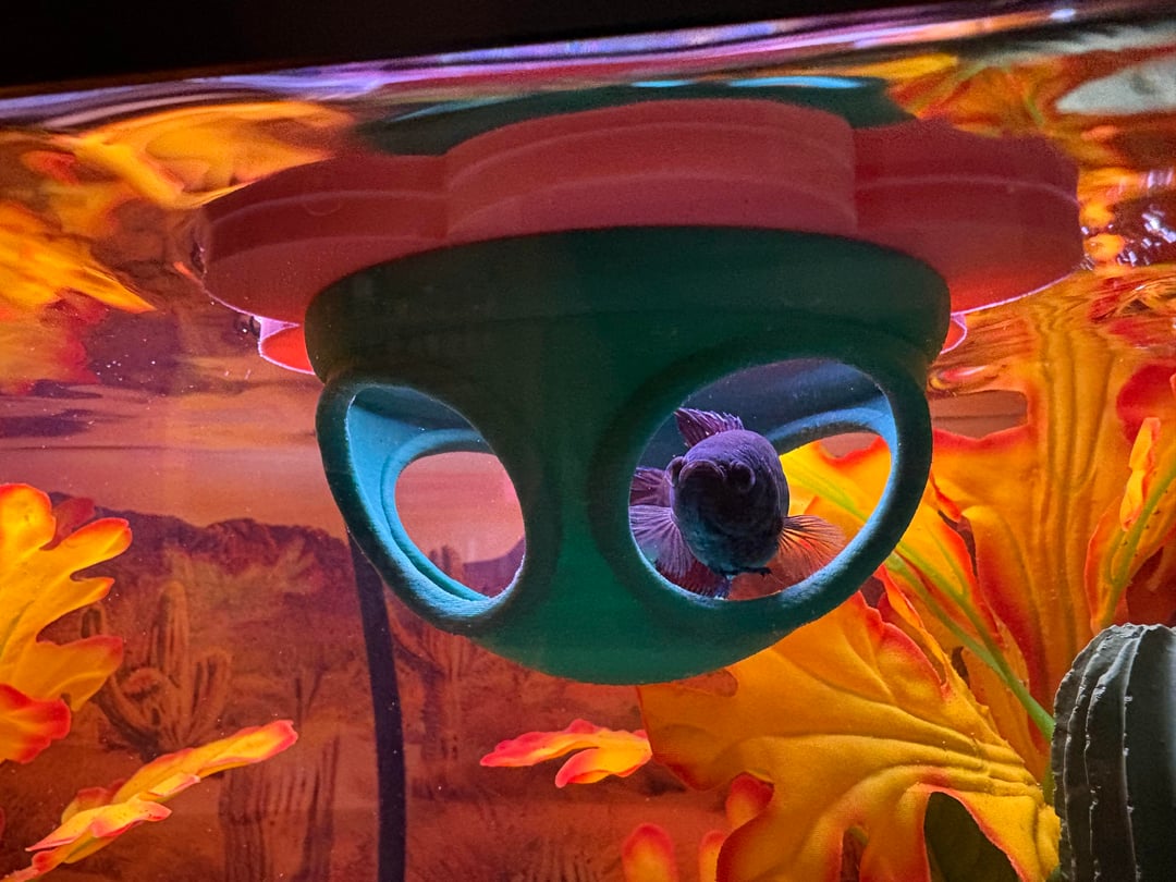 It’s just a 5.5G tank that I keep for this 3+ year old former “baby girl” betta from PetCo and her mystery snail companion. I know some would say 5G is not enough, but she seems to be less happy in bigger tanks and hides more, even with a lot of cover. In here, she is chunky, interactive, clever.