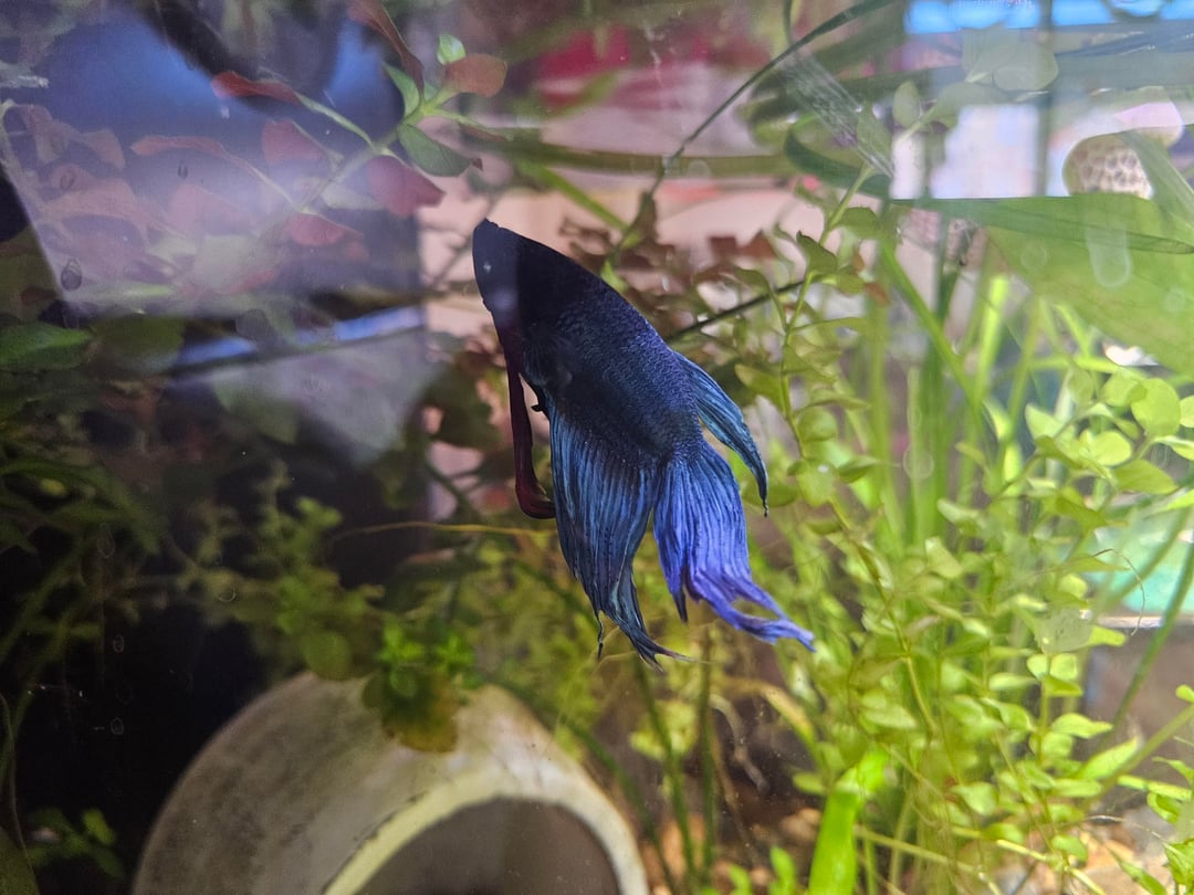 Tank is 20 gallon, 0 ammonia, 0 nitrite, 10-15 nitrate as of this morning. The corner filter was converted to a sponge filter and the heater is set to 25°c. I've been doing 25-30% water changes every 3 days, and the only living beings in there besides Bruce are 2 otos and a handful of bladder snails. And a crap load of plants, obviously.