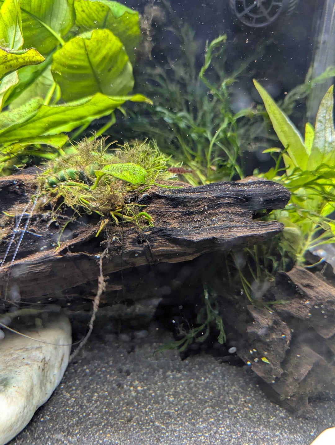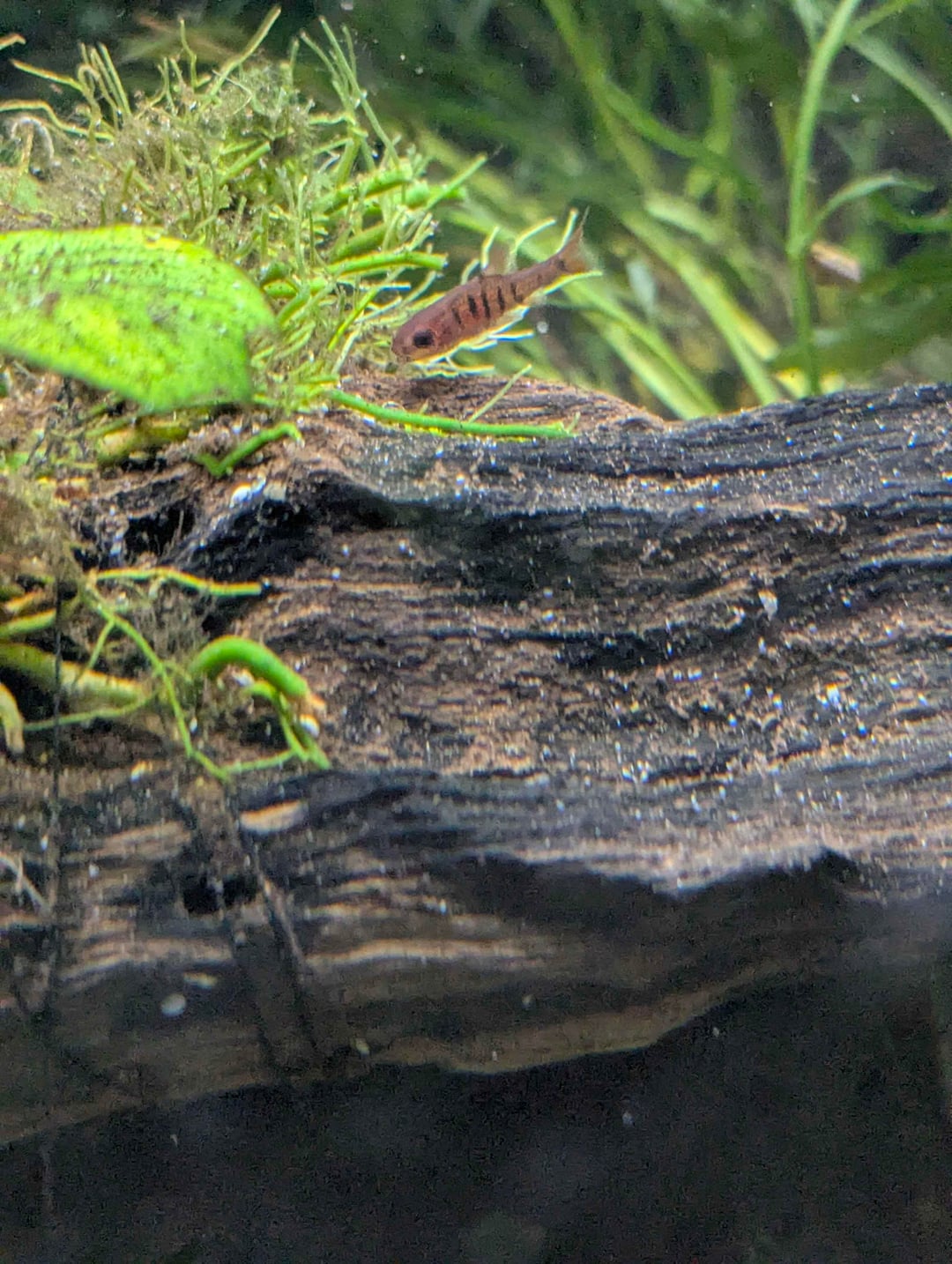 Yesterday while cooing over my new kohaku guppies I noticed this little guy! My Angolan barbs have bred and this guy has survived to be big enough that nothing will bother him in a community tank! Extremely cool!