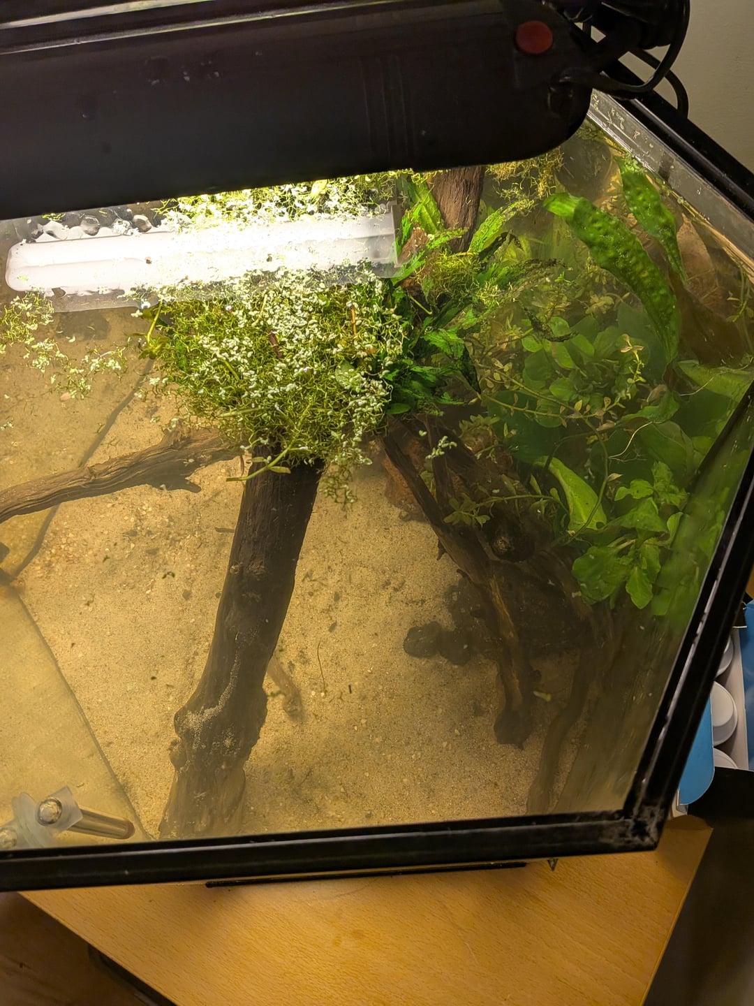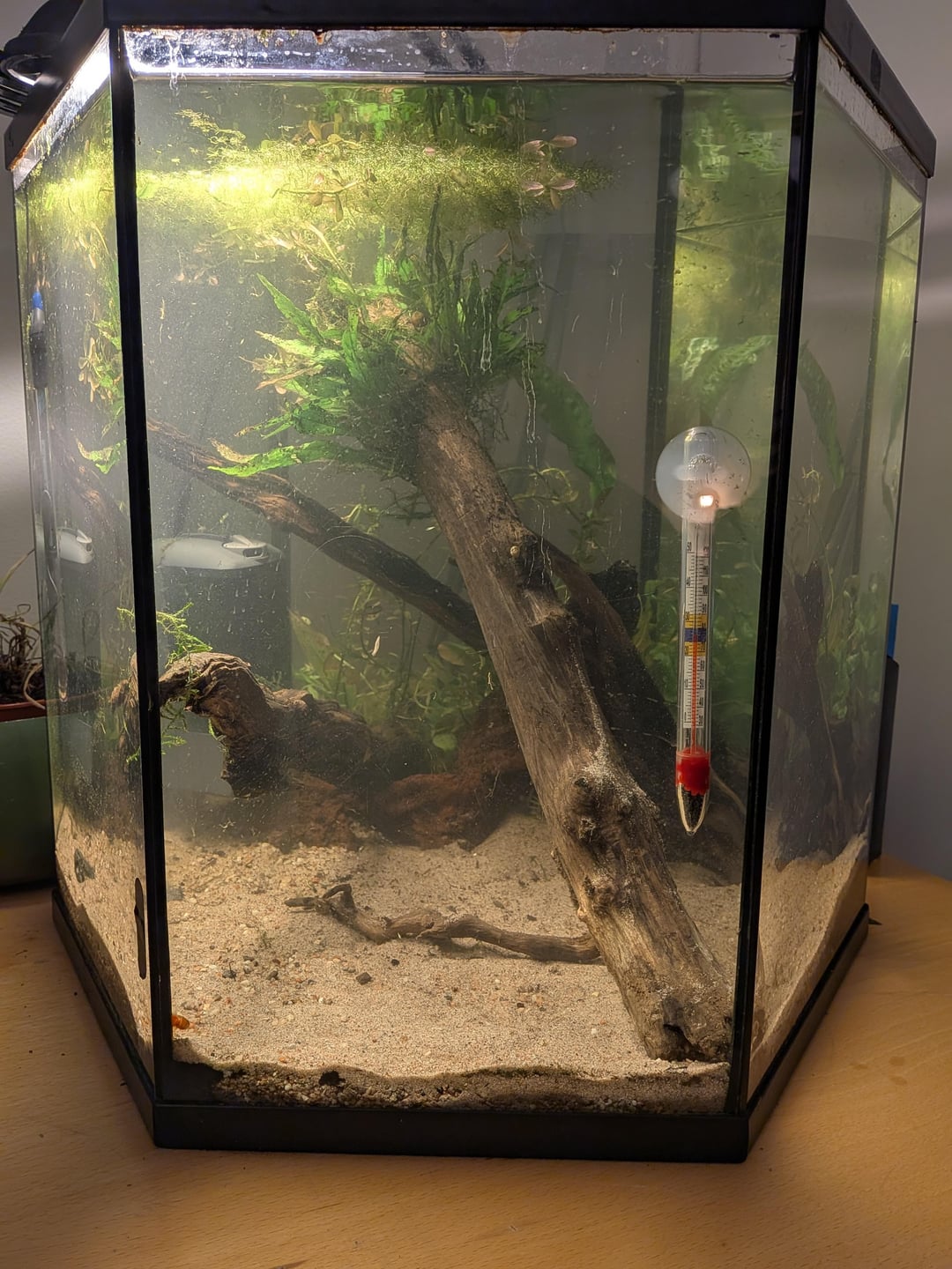I am an absolute beginner who inherited a 20gal hex tank with a gravel / dirt substrate and some really poorly maintained substrate. It had planaria worms, tons of snails, and some shrimp. The substrate got really disturbed when moving the tank, so I decided to start over as the tank was really dirty and the shrimp died from the ammonia explosion.