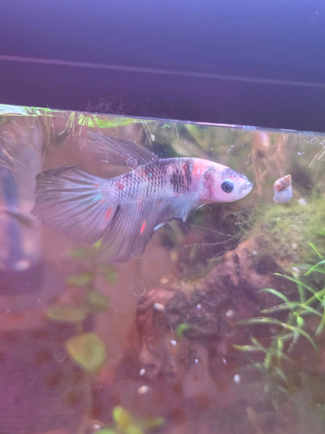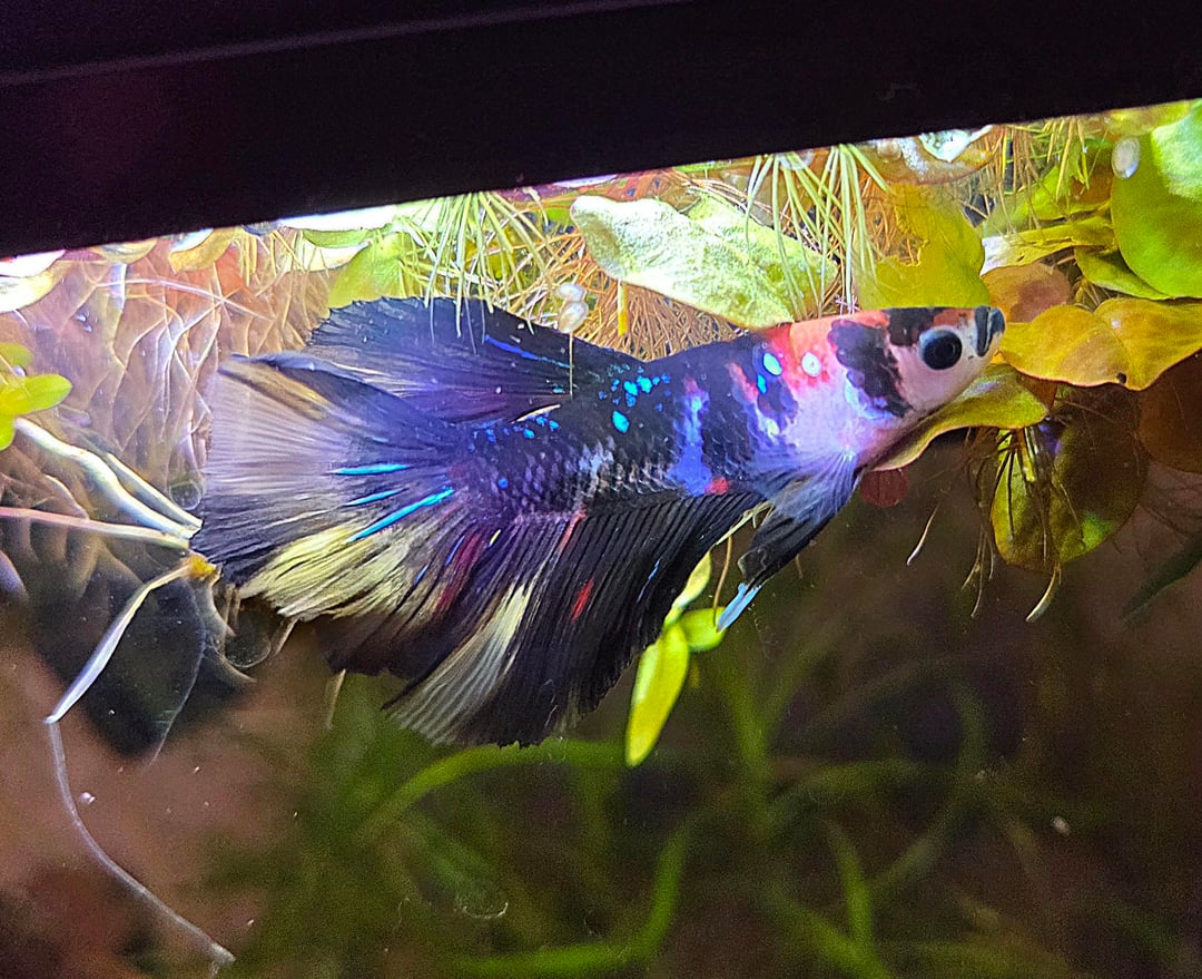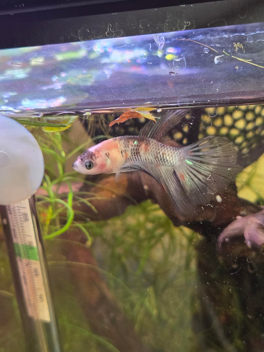 He has 1 clear tummy fin and 1 black with iridescent tipped tummy fin. He loves attention and is always hungry. He watches us walk around the bedroom and is so curious about everything. He does seem to be a bit lonely though and I really wish I could ethically fit more friends in his 10gal :((