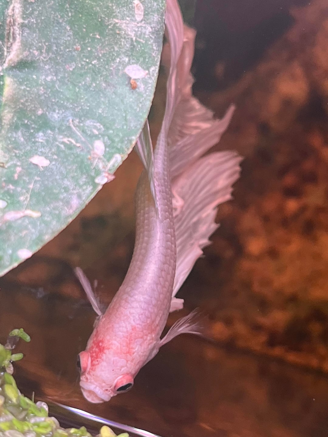 my betta has this weird coloration on his head, and i’m not sure if he’s just developing color or not, he also has this red in his tail but it just looks weird on his head. also i feel like he looks like he’s pineconing but i don’t know if im just tripping myself out or not. please let me know what you think.