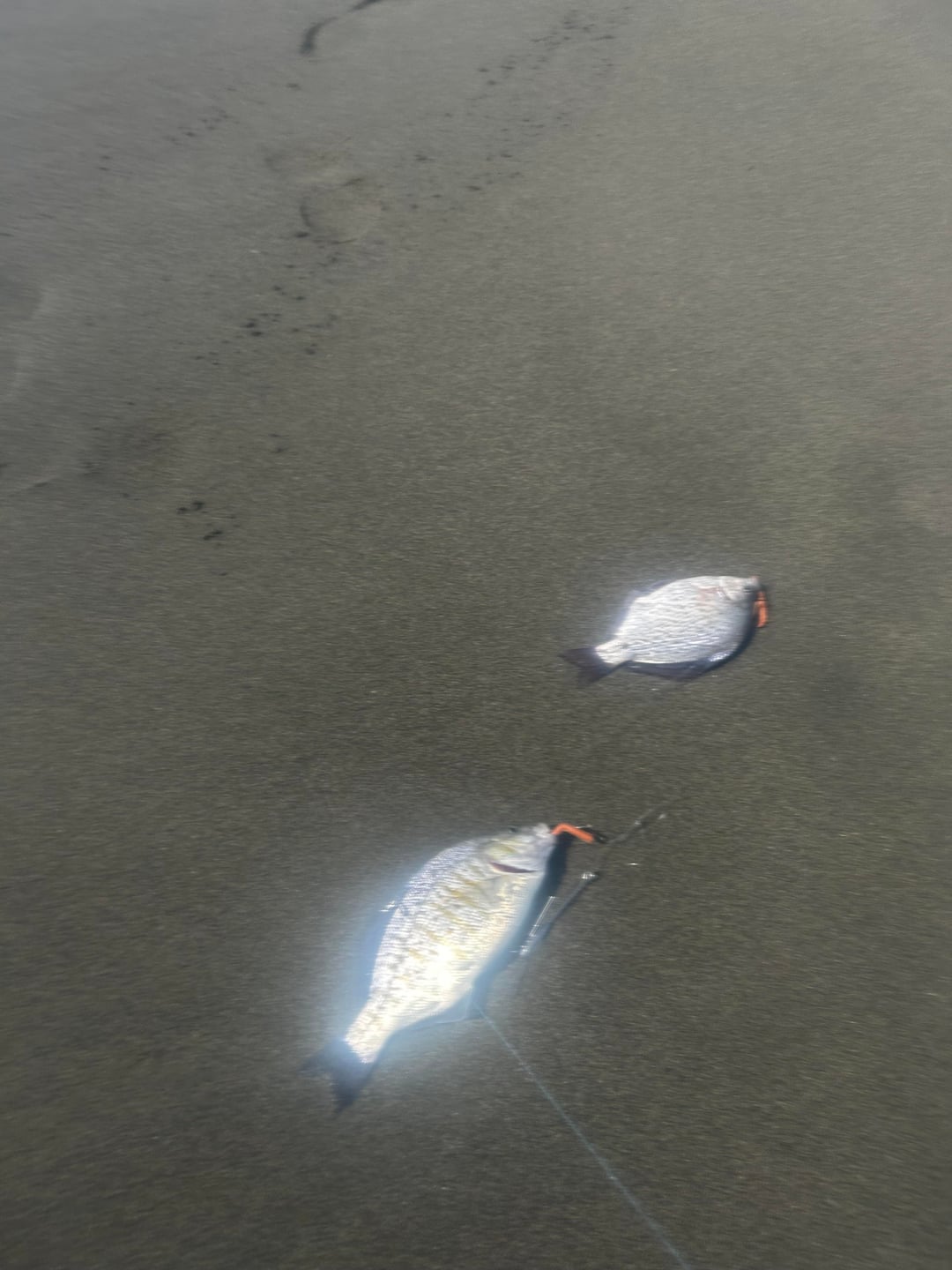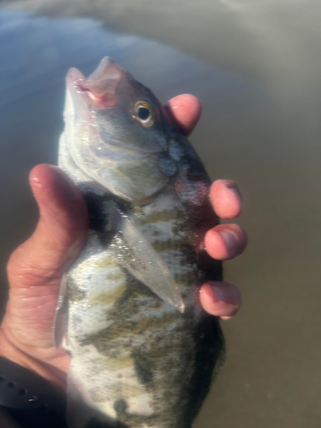 Big winds and waves today but it was possible to be on both sides of the high tide. High low rig with a one oz Sputnik. Feel beat up but had a great time. Couple of banded and one calico. Apologize for condition of pic, technical difficulties.