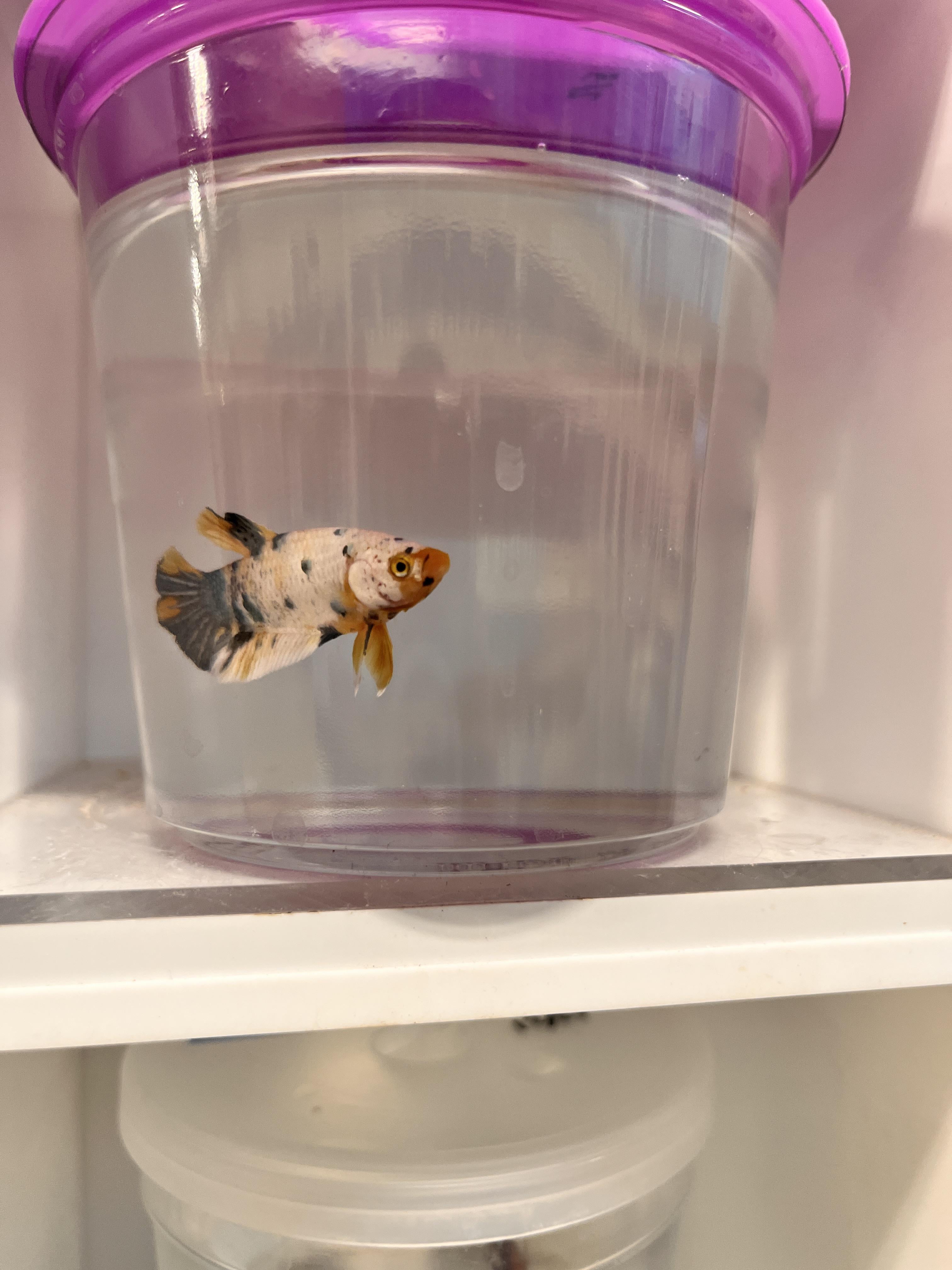 I mistakenly didn’t take a photo of the top of the cup, everyday i debate going back for him but im in search of a female for my new tank im keeping 4 hillstream loaches in…this guy looks like a fricken fancy goldfish, you can just tell by looking at him too he had a great personality. Should i go back??? My male betta did not like the hillstreams so ;-; but maybe that was just him