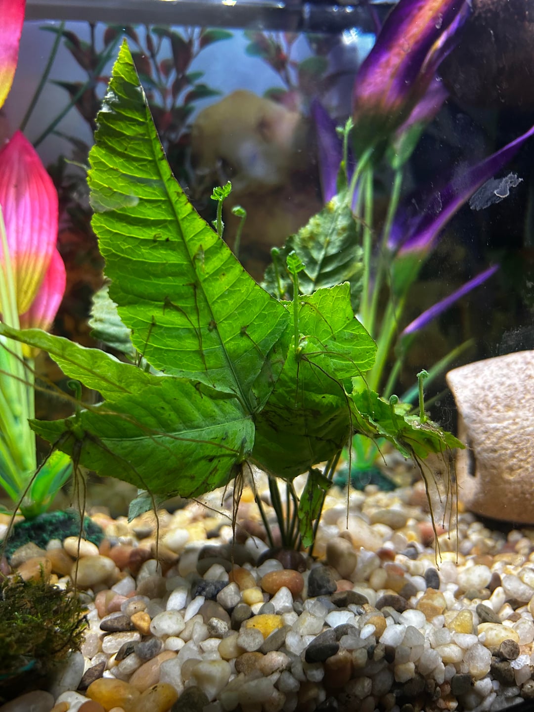Aw baby ferns! I plucked mine off once they got good roots and I could see a tiny nub of a rhizome. My tank ended up crashed but one of the babies made it, I glued it to a shell and it’s about 2.5 inches tall now with loooooong roots.