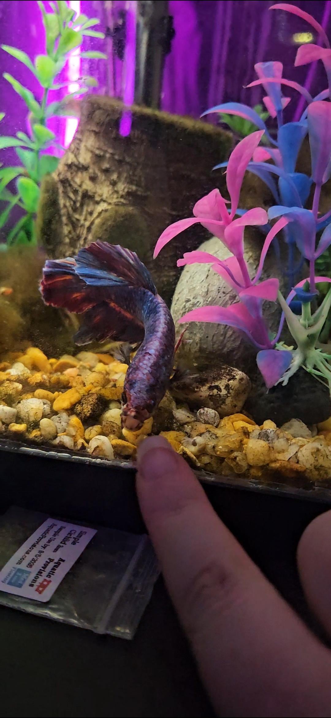 Just my buddy Robbie being a silly goober at my finger. He's a very, VERY sociable betta and I love him to pieces. Also, he's a king betta.