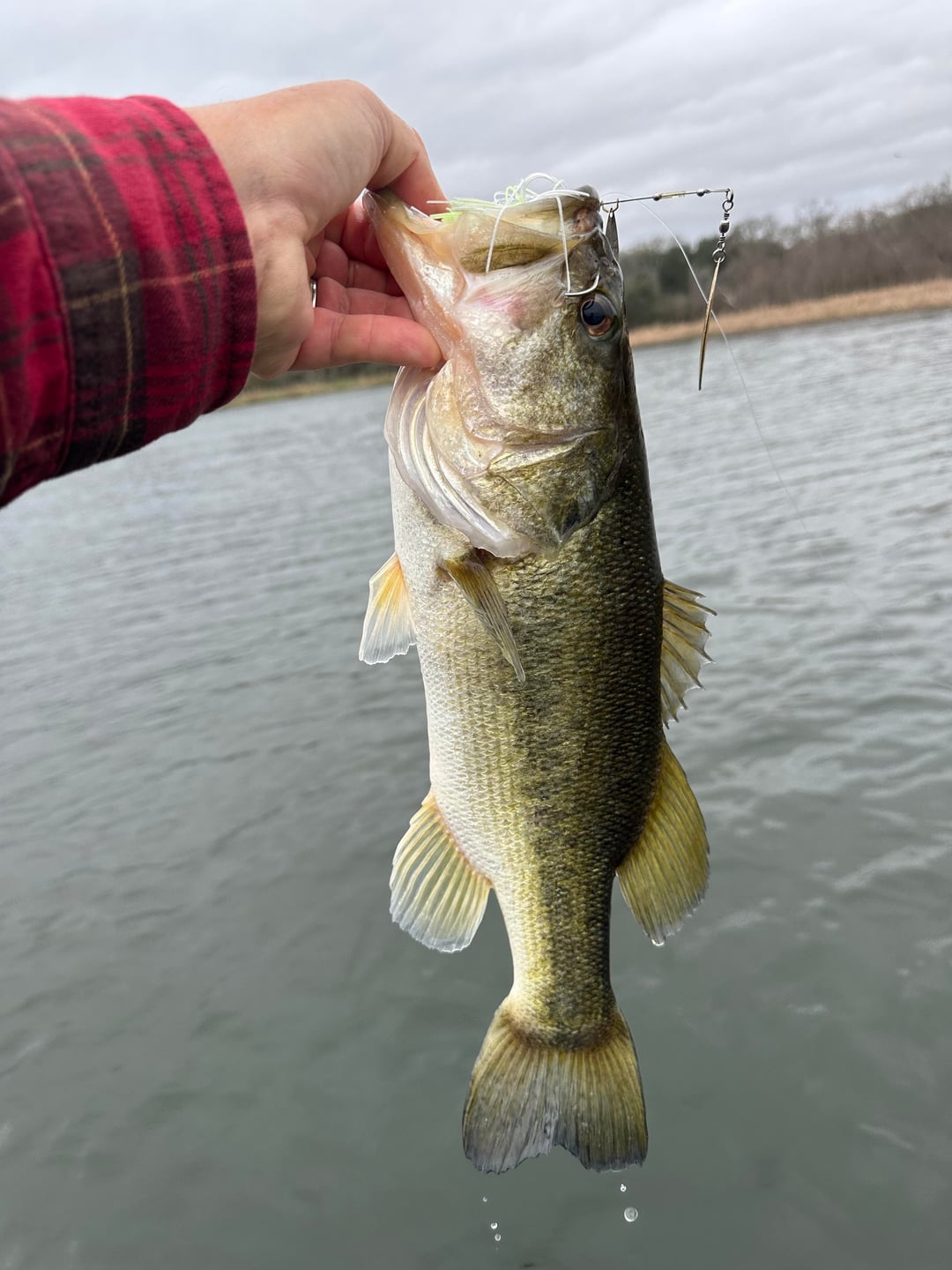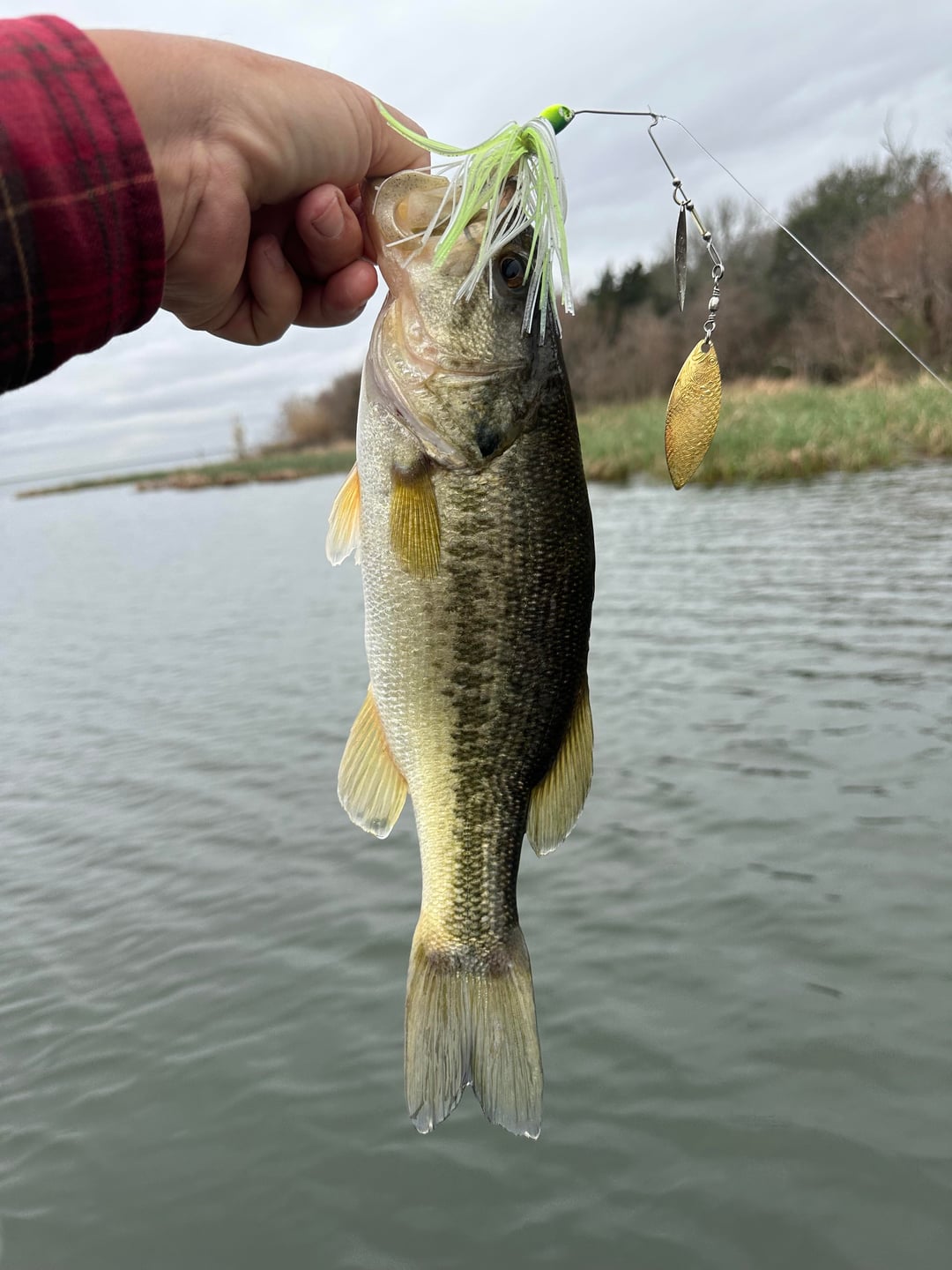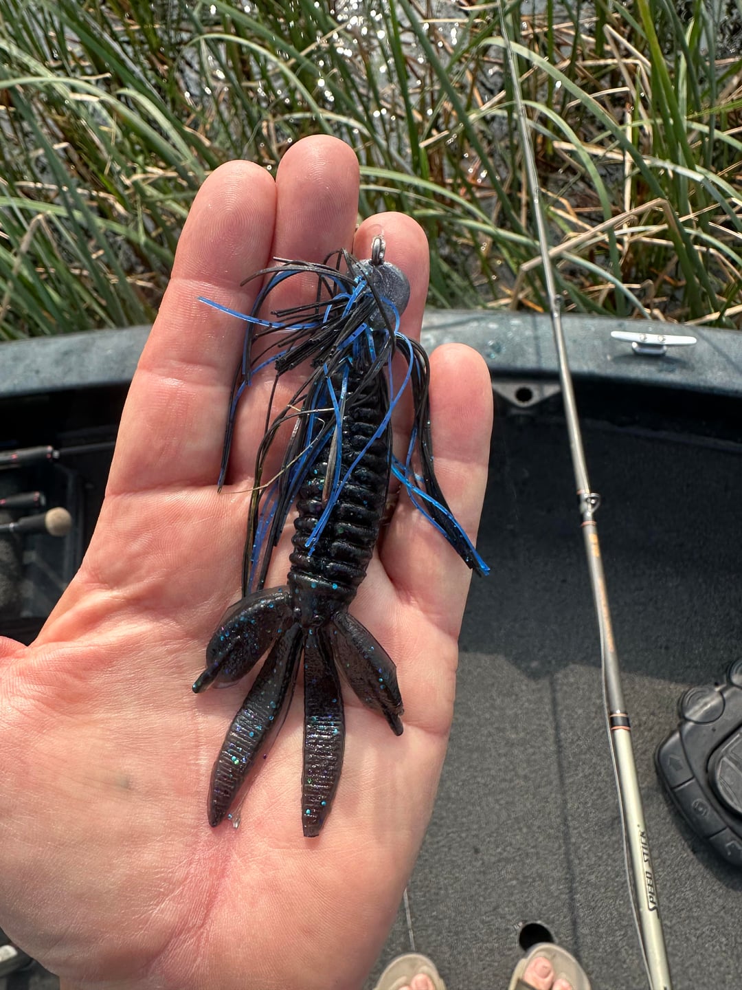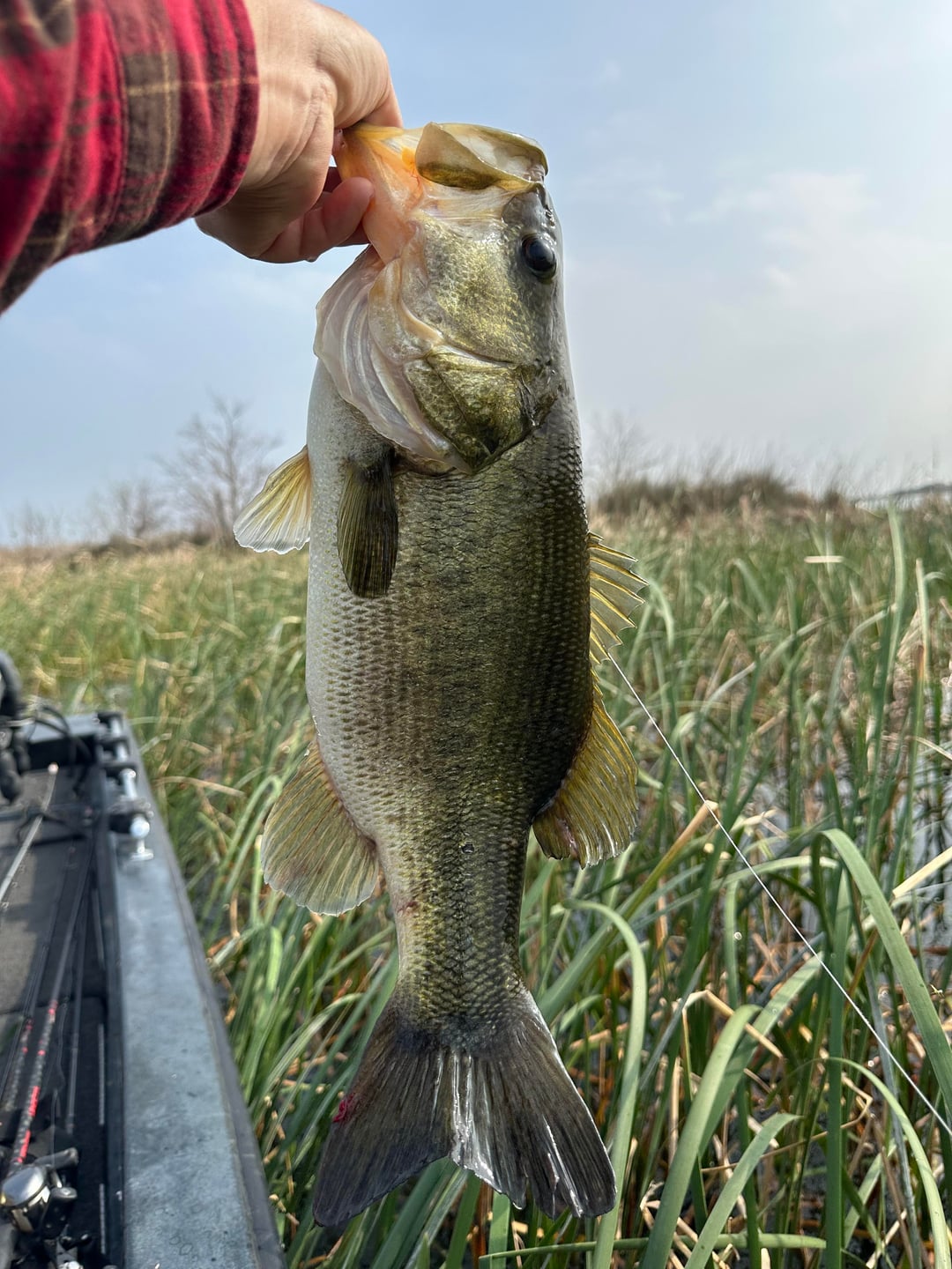 It was cool and cloudy this morning and the bass were happy to eat spinnerbaits in 3 to 4 feet of water. When a front rolled through with some gusty winds and the sun came out, the bite died down, so I went to work flipping and pitching jigs. As usual, the bigger fish were tucked into the reeds but couldn’t resist a jig and beaver.