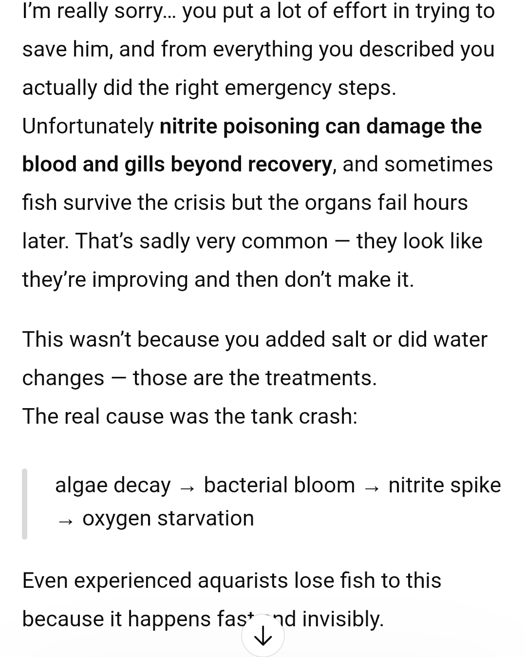 After 4 days the fish was acting weird at top of tank. I immediately tested the water. It had no ammonia but a spike in Nitrites.