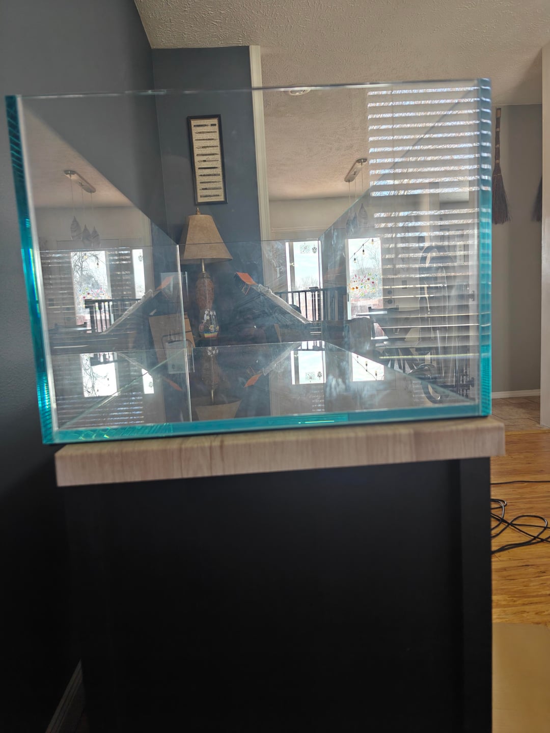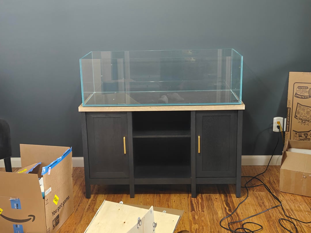 The corners of the tank absolutely should be in contact with the surface. 100%, use plywood if you’re going to use this stand. I did this once for: I also sanded the edges of the plywood and treated it or stained with something to protect against water.