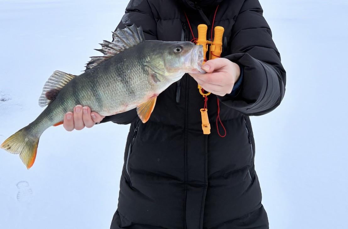 After some hours fishing with just a few bites, girlfriend lands a lunker of a perch, over 40 centimeters and above 1 kilo, great way to end a day on the ice Posted by BillSwede
