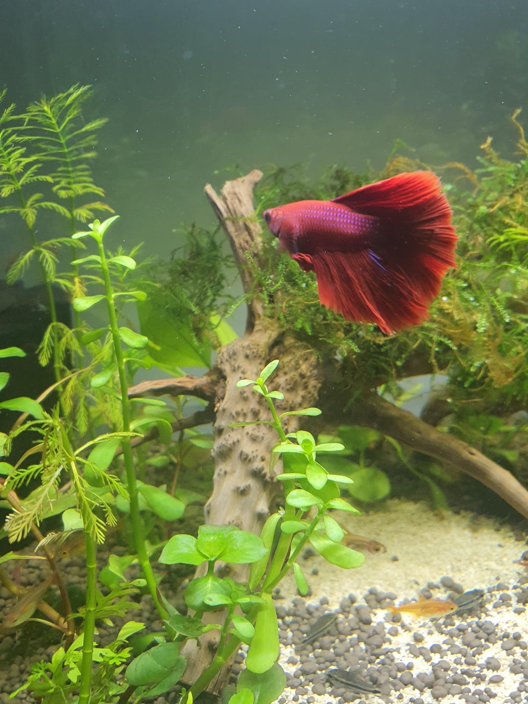 i feed my betta fish 1-2 pellets a day but when i feed my pygmy corydoras and ember tetras he goes to the bottom and also eat some of their food. he looks lound and i dont know what to do/fix how i feed him