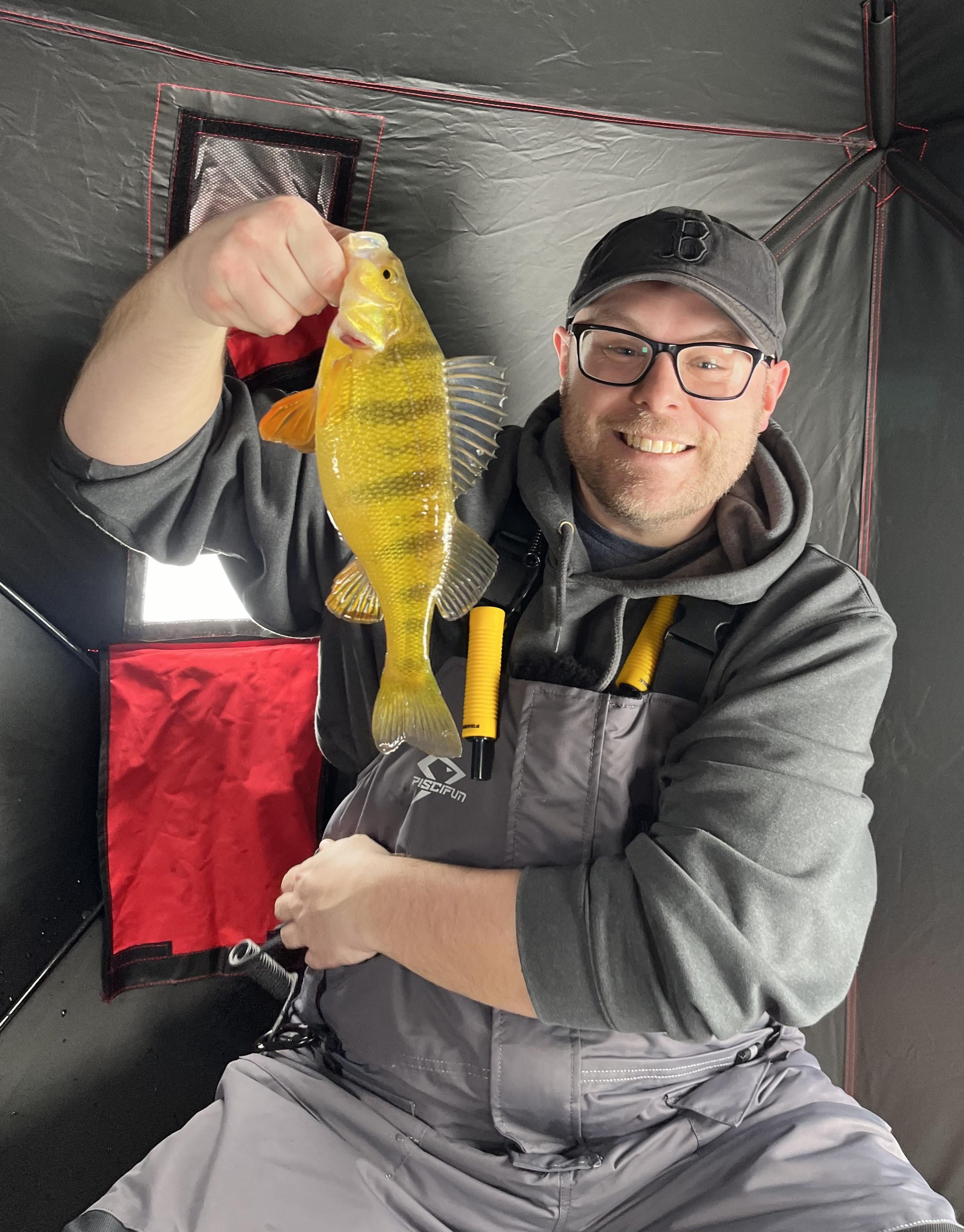 Took my friend out for his first ice fishing trip the other day. Not much action, but I did land this long fat yellow perch! New PB for me. Posted by DietWaffles