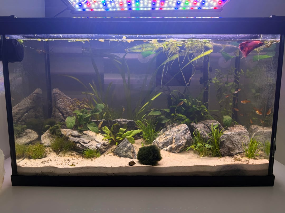 my betta (ken), is the most chill guy ever, and the embers seem to enjoy following him around. i’ve got a handful of amanos (some huge ones), and 2 zebra snails. i’m hoping to add some pygmy corys, cherry shrimp and maybe eventually otos. although if anyone has any other suggestions, im open to changing the plan!