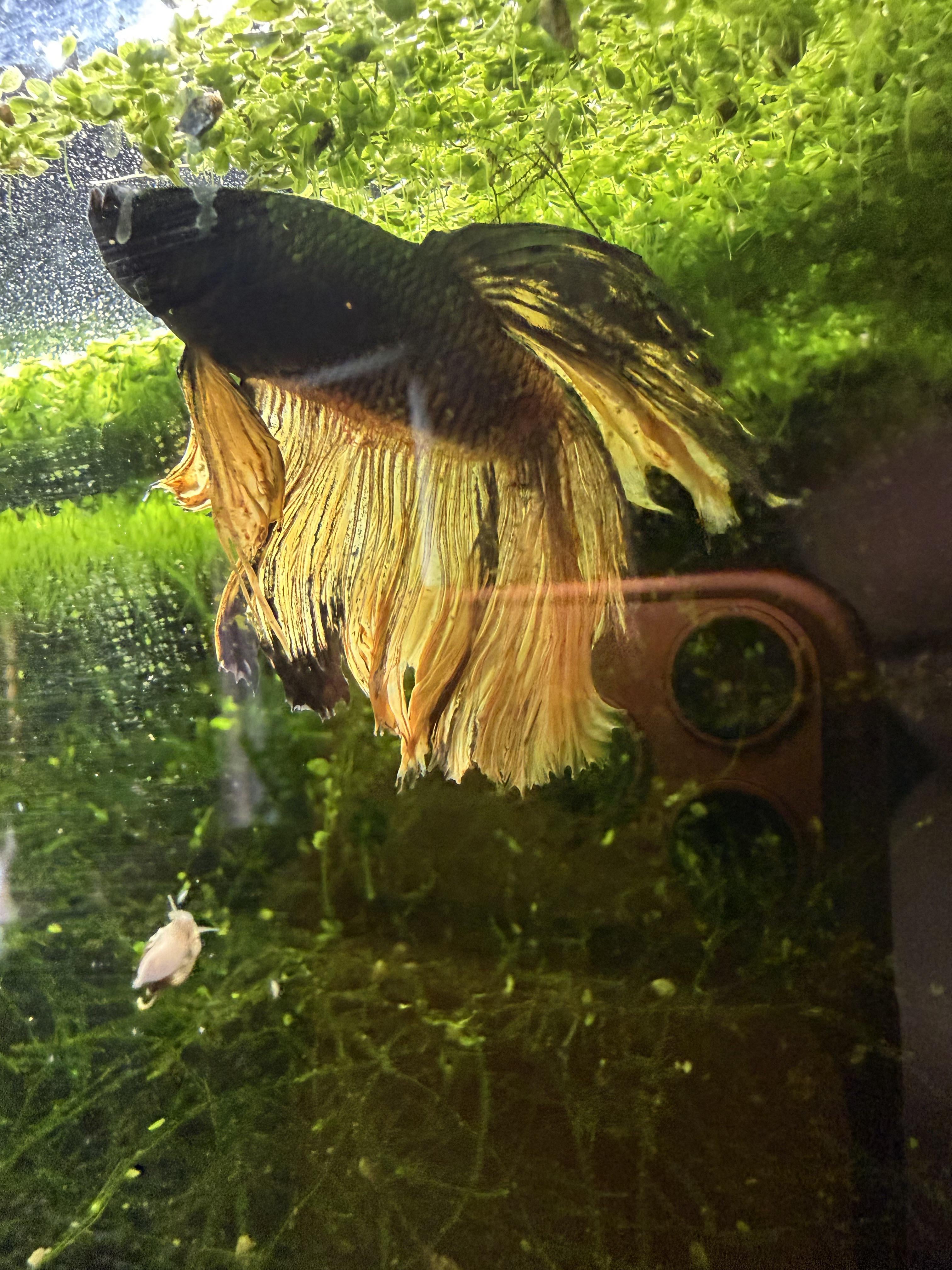Sorry for the crappy photo. Thought maybe someone here would appreciate this. His names Flounder and he was my third Betta after accidentally murdering two while learning the hobby (I now keep large freshwater puffers, currently planning for an Mbu). He started as just my young daughter’s pet. I started breeding snails in his tank (you can never have enough with puffers around) after she lost interest, and it’s become somewhat of a science experiment now. Tons of Java moss and duckweed. Oversized Seachem Tidal filter. Fluval Nano Plant light. I feed very heavily every day to keep the snail population up. Nitrates never get above 10. I can’t believe this guy is going on 7 years old. Anyone else have older Bettas?