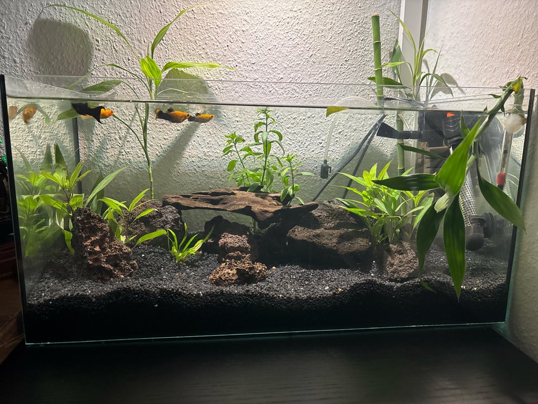 I would add more plants to the back to give more depht! Also, bw careful with bamboo. Mine rotted in my tank. Now I only have roots dipped into the tank
