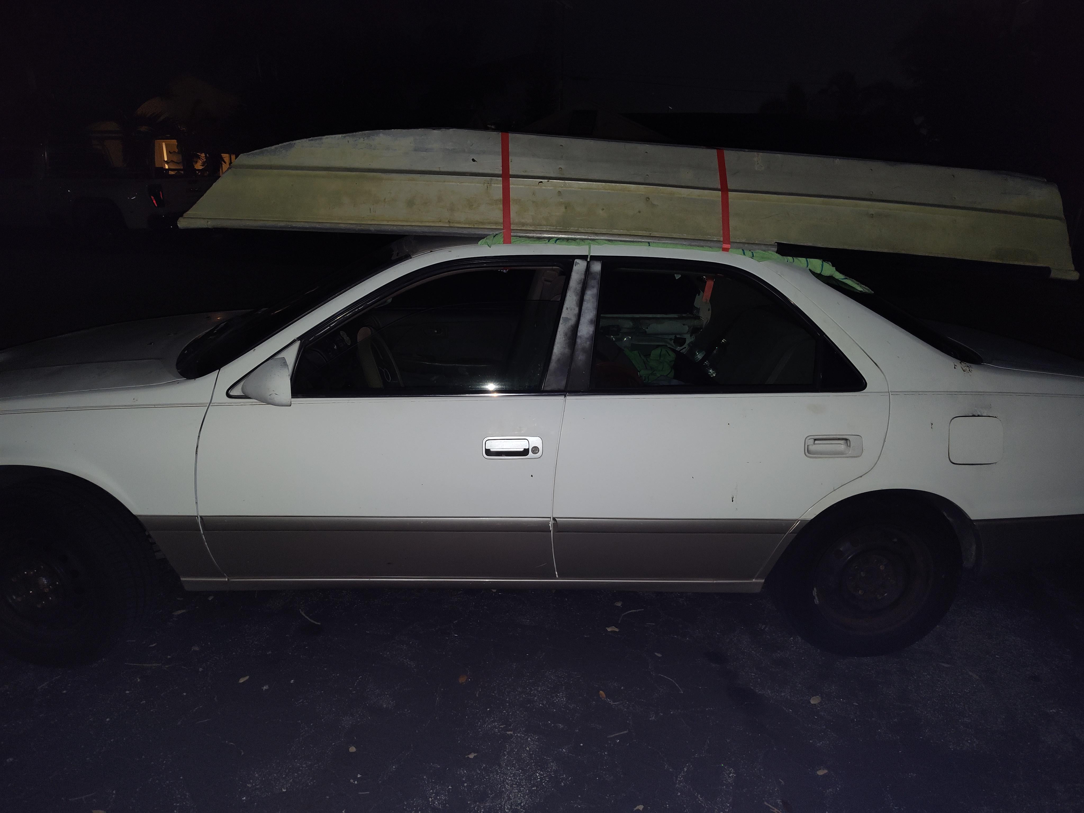 First boat, impulse bought for my 28th birthday. Drove 200 miles after work round trip for it. 50 mph max, no wind at night. Pretty stable up there. 2000 Toyota Camry get out there and hunt for deals on marketplace! Posted by Matthewbim11