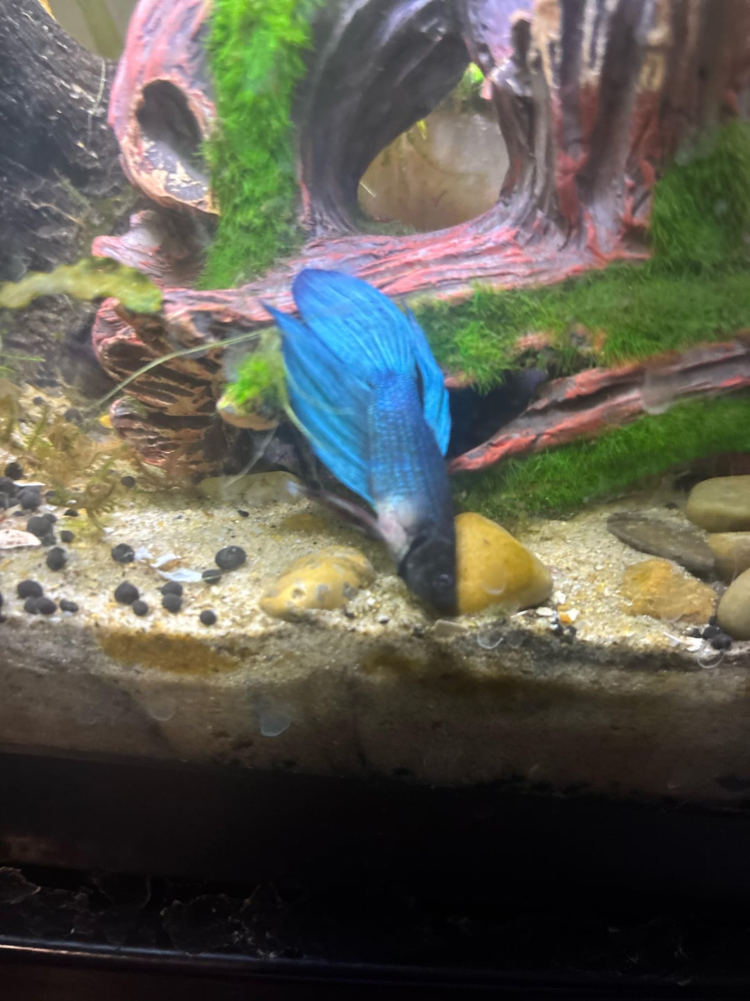 hes dead. i sat and watched him take his last breath and hell his little container. he sunk to the bottom of the tank so i moved him into a shallow container to help him breathe and he just never came up for air im so devastated. he died with his last 3 days in a beautiful tank and extremely lovedðŸ˜with literal 24 hour care i tried so hard to get him to eat
