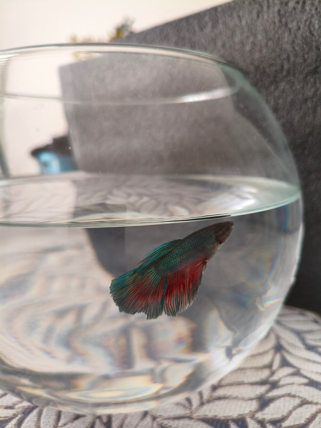 We were given a betta fish, and we don’t know how to take care of fish. This fish is supposed to live in warm water, but we were told that it was kept in cold water at the store and that it can adapt to cold water. It ate the food but then spat it out, so we didn’t give it any more, although there were some leftovers in the tank. To clean it, we drained all the water. We treated the new water with Aquatan, but now we’ve learned that we shouldn’t have emptied the tank completely like that.