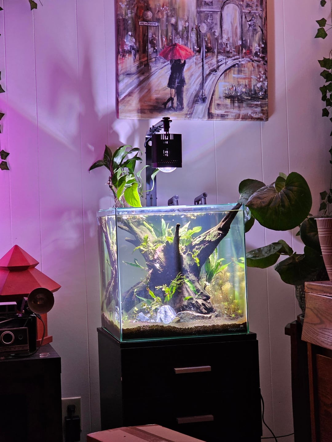 I absolutely love the look of it, but just bear in mind it’s taking up a big chunk of water so buy fish accordingly. Pearl Danios or Chili Rasboras would look awesome imo.