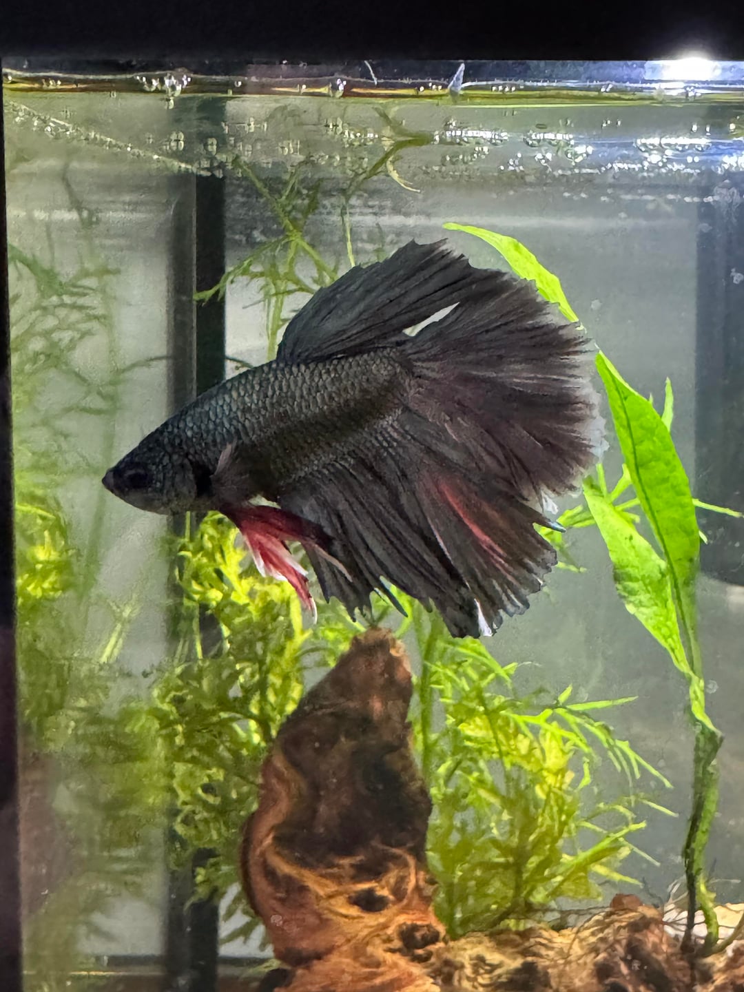 Say hello to my new betta (and his tank). He doesn’t have a name yet, and I was hoping yall could help with that. I was thinking something draconic as I’m on a bit of a GOT/DOTD/KOTSK kick but none of the dragons match the colours/personality as he (the betta) seems to be pretty aggressive (going after his reflection quite a bit and bumping the container while I was examining him at the pet store).
