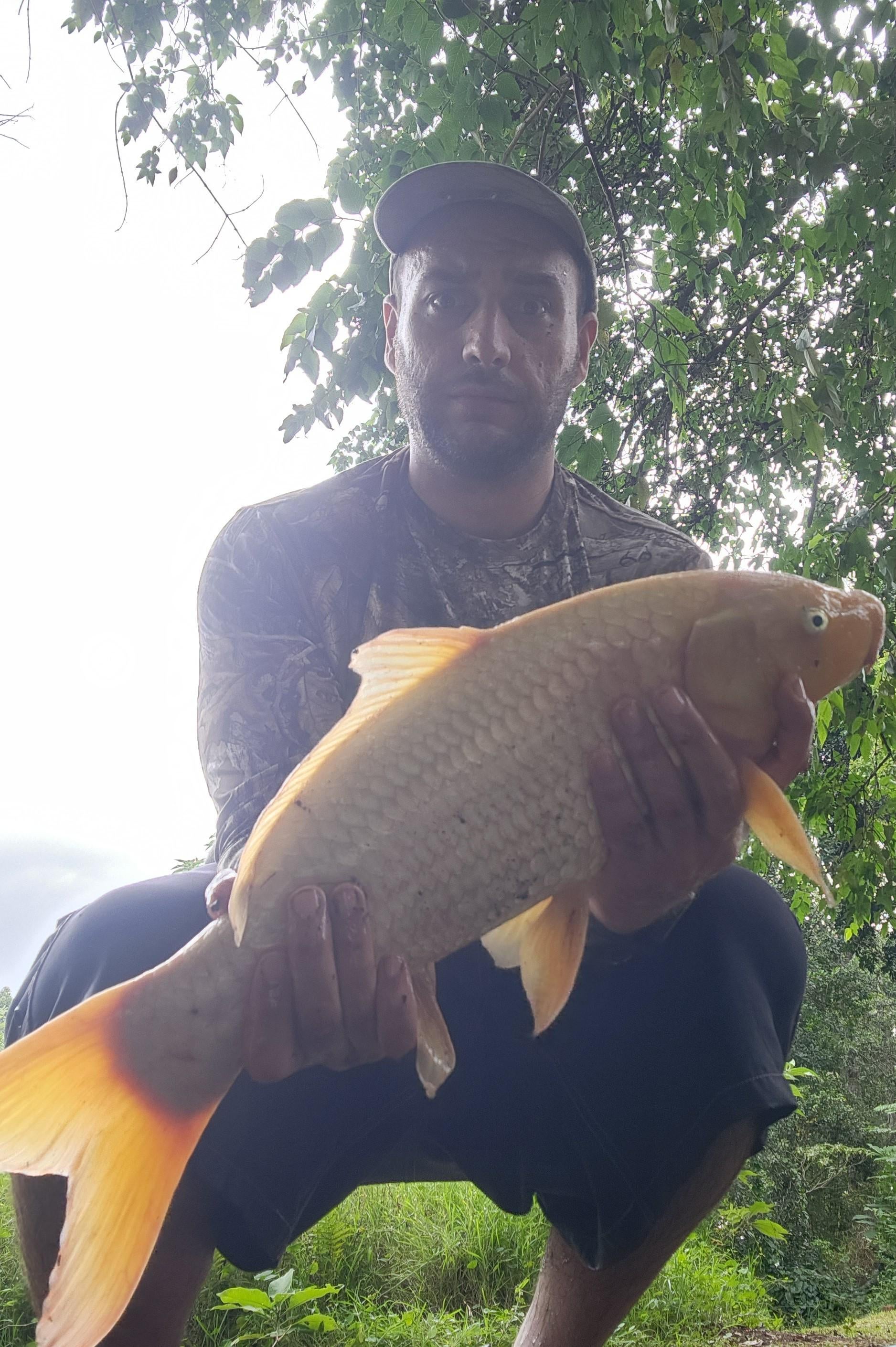 I was in the middle of setting up the second rod when my alarm went wild, I picked up the rod, felt the fish was on and then saw the golden koi I had been watching roll under the surface. It fought surprisingly hard for its size and even had the audacity to try and take me under an overhanging tree. I got it in the net and it weighed in at 3Kg, so not earth shattering but it's a really pretty fish in such good condition. Besides, when you're fishing a lake where the main background scenery is the big Toyota dealership up the road, anything goes!
