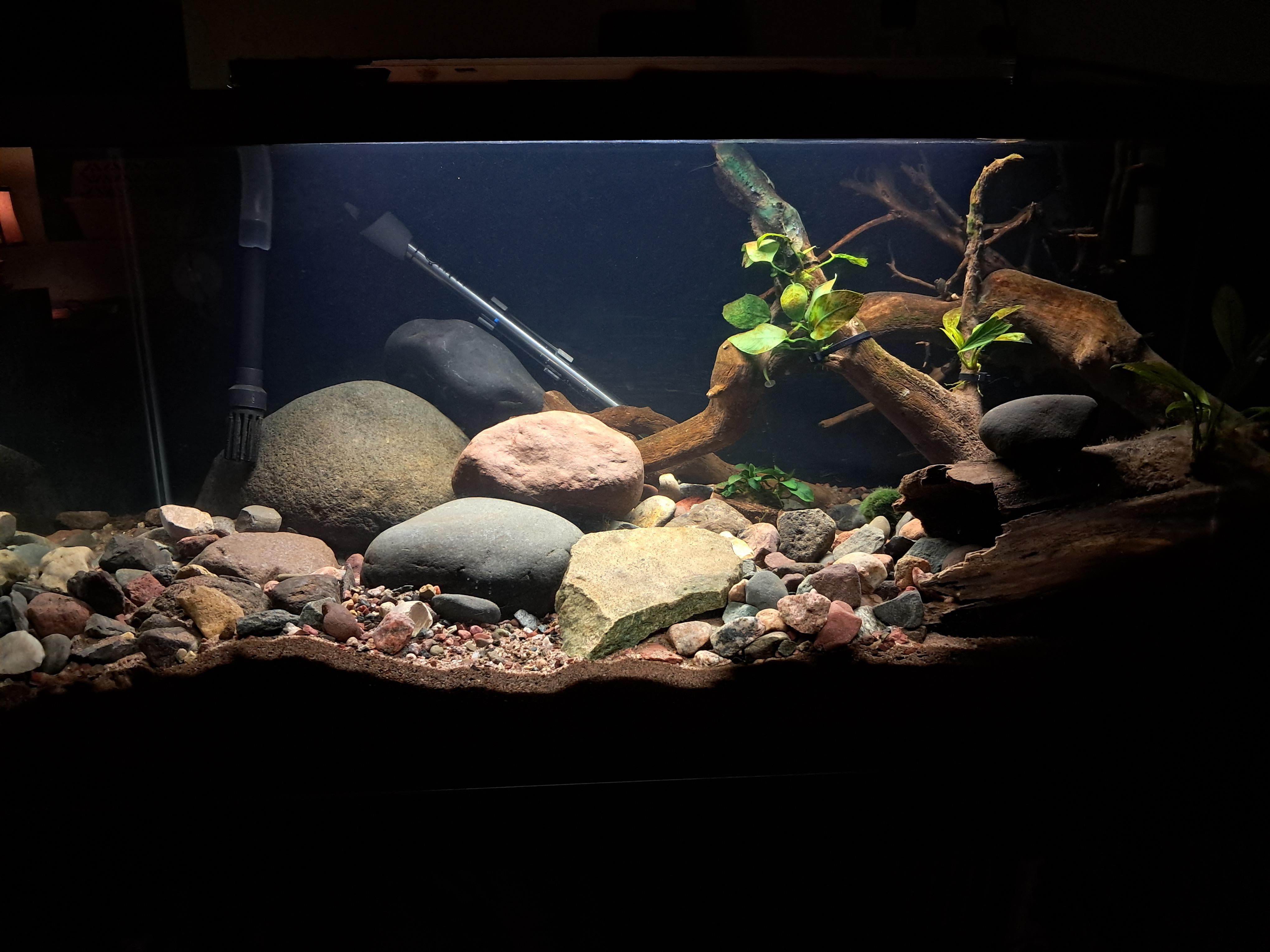 40 breeder. I'm sure it's nowhere near professional level aquascaping, but I learned everything from scratch and I'm proud of it. I have experience with bioactive vivariums and was happy to find that some of it crosses over to fishkeeping, but it's been a learning curve for sure! Just finished cycling, planning to eventually stock with white cloud mountain minnows, hillstream loaches, and bamboo shrimp.