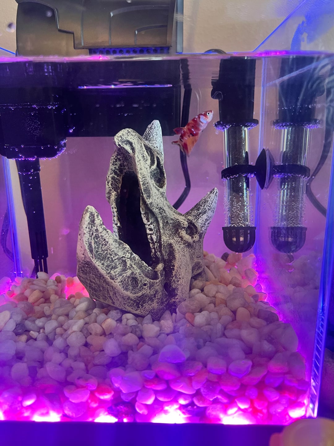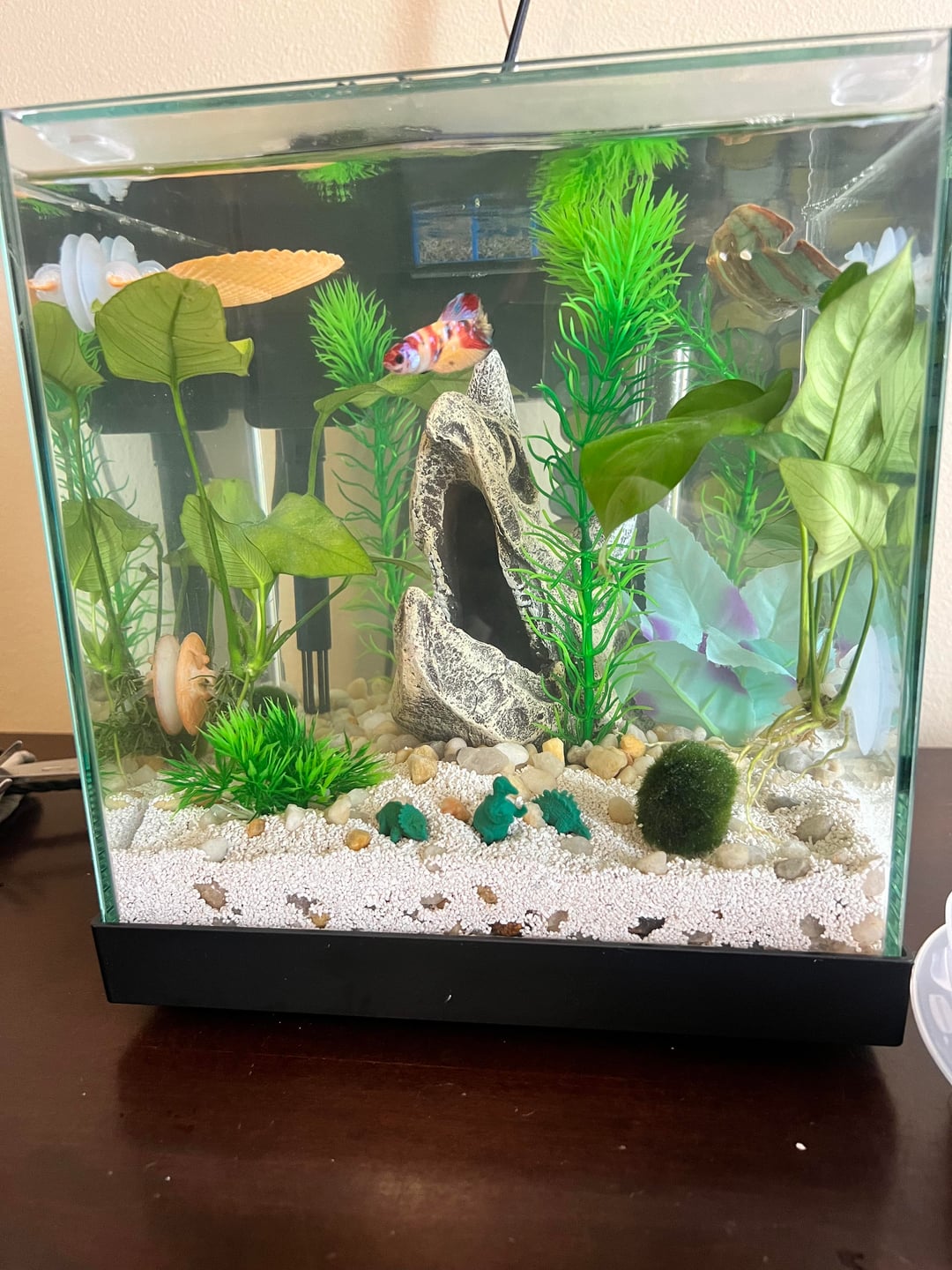 Hey guys!Ever since I joined this subreddit I have learned a LOT! I do have a question: how could I make this tank better for him? 2nd pic is when we first got him. I’m always improving and striving to make him most at home. Specifically: I just took out a huge bulk of the pebbles in his tank, but do I still have too much substrate? I want to make sure he has maximum swimming room until he gets his big tank. His tank is completely cycled!