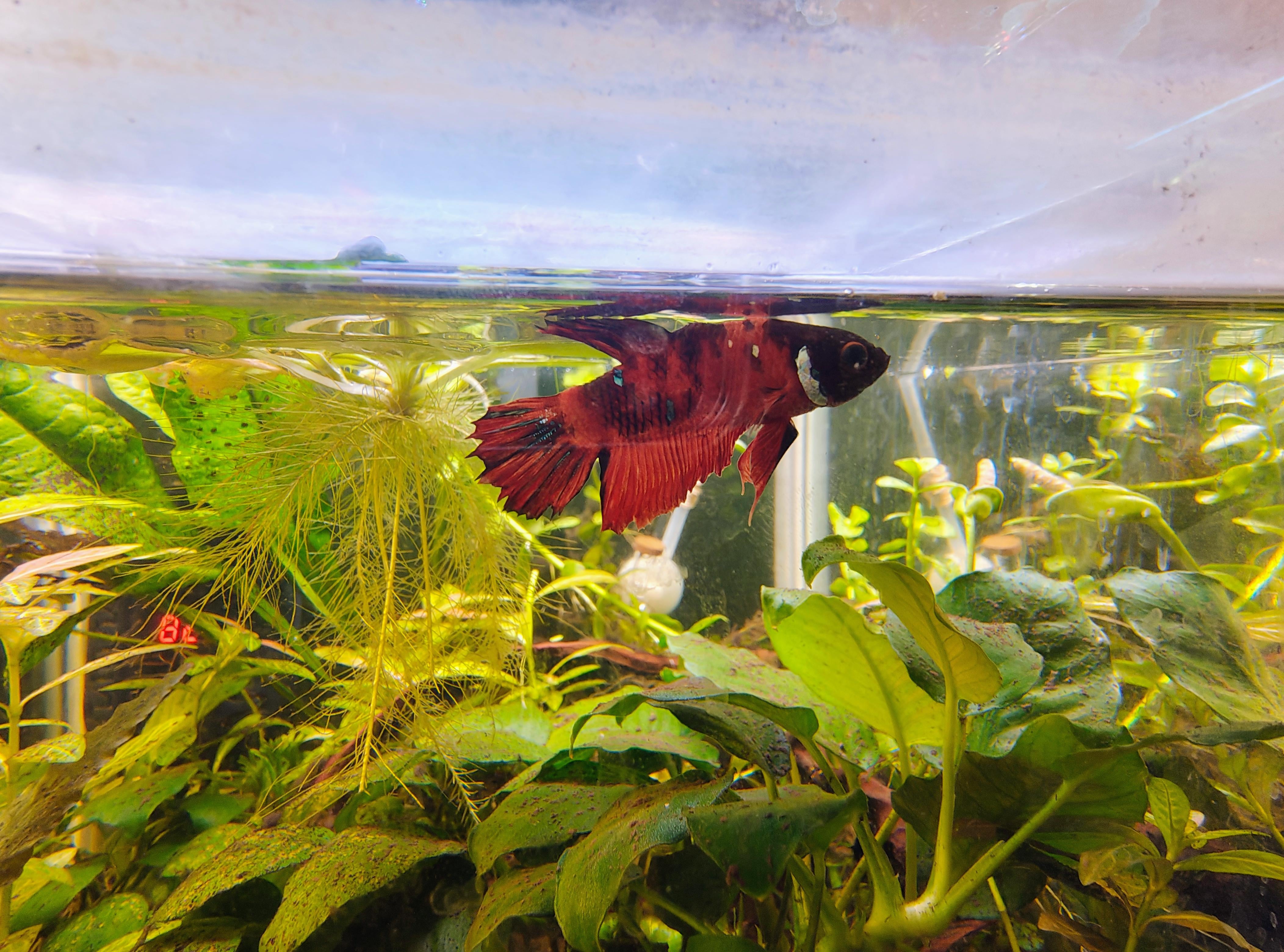 He lives in an 8 gal heavily planted dirted aquarium with good water parameters, just for caution I've been doing a 10% water change every other day