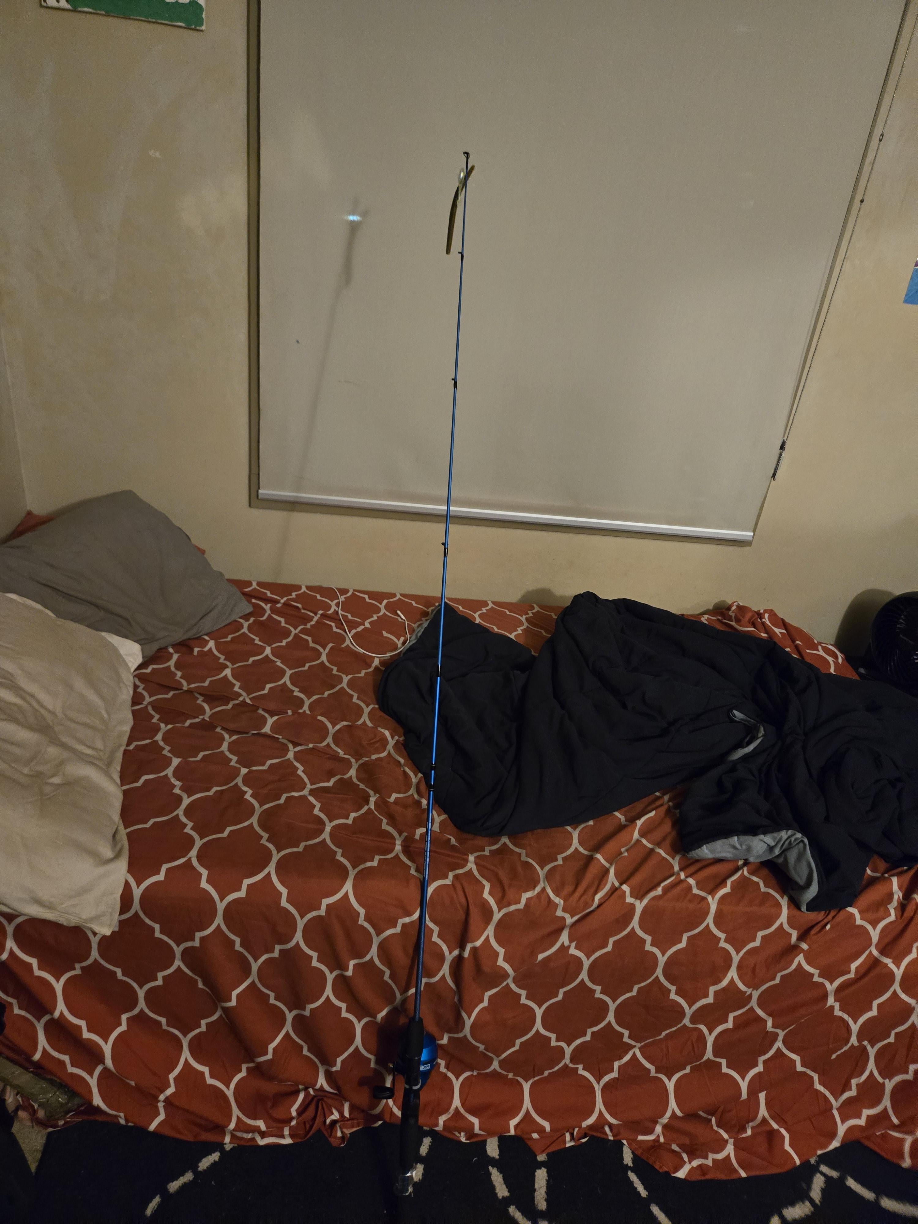 Today, I bought this fishing rod because I will be going fishing again for the first time since 2015 (funnily, I didn't catch any fish that year, but I'll probably have some luck this year). Like the title suggests, my cat tried playing with the bait… I am hiding the rod from him.