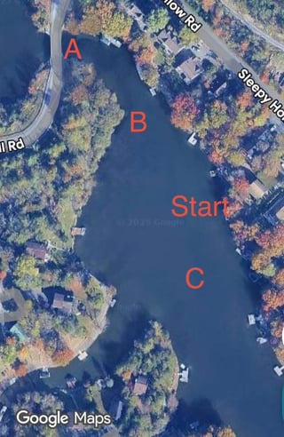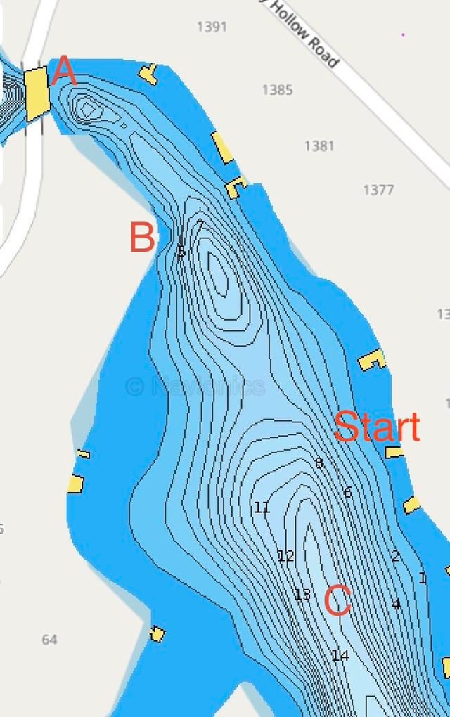1. I would take my time working the elevation changes around B and A first, it’s a natural choke point so it’s pretty likely to have fish moving through it or hanging around where it begins to open up some.